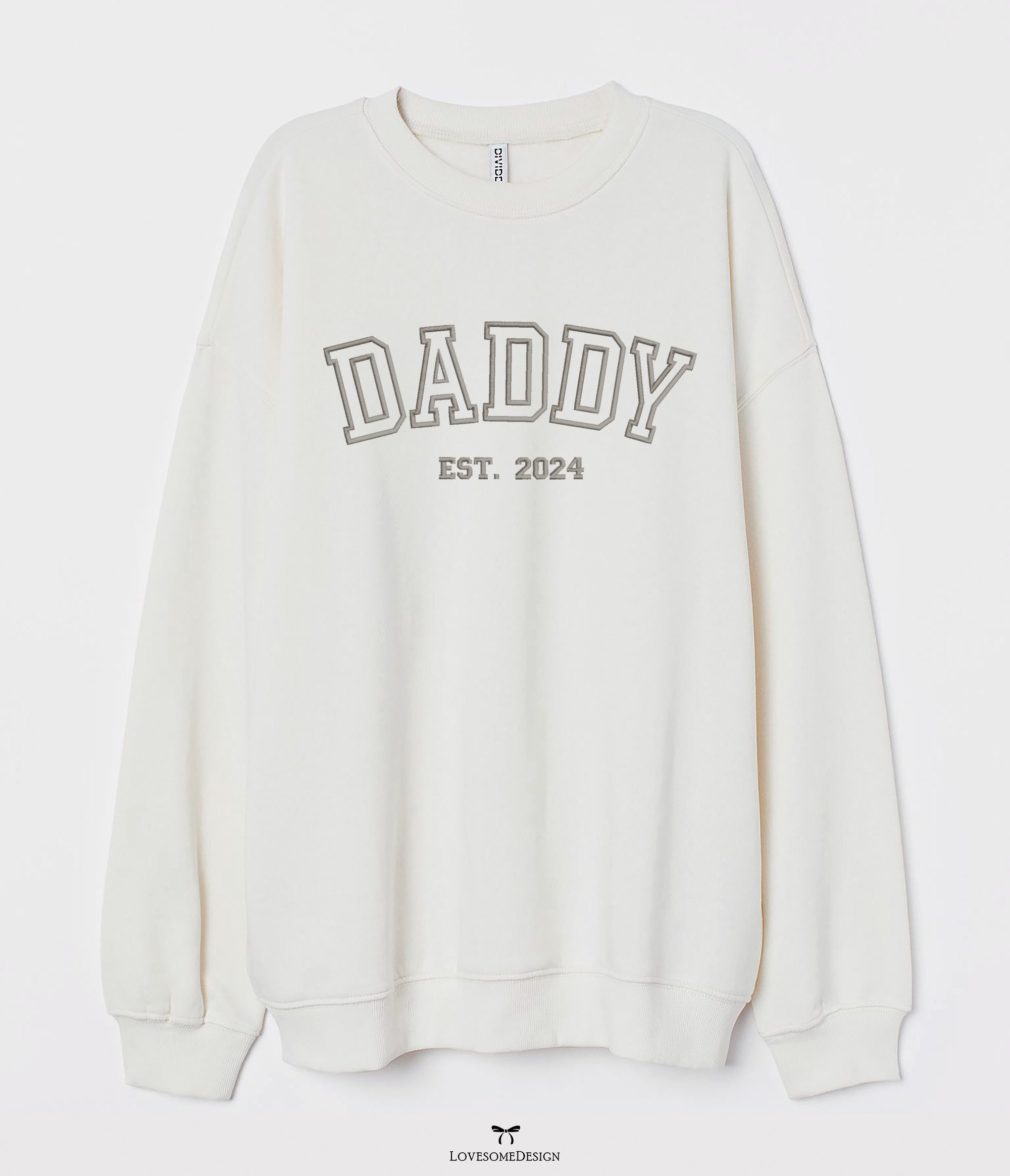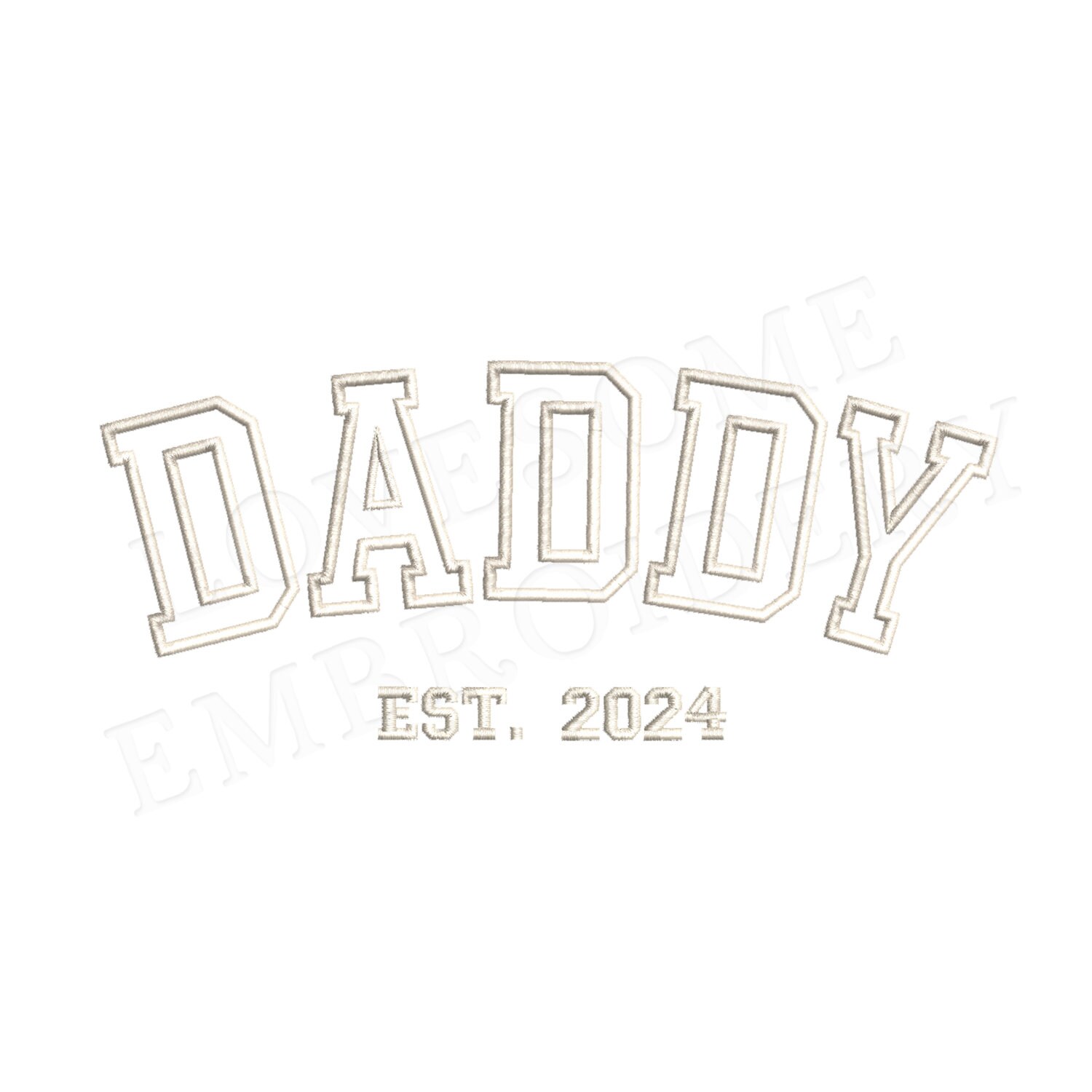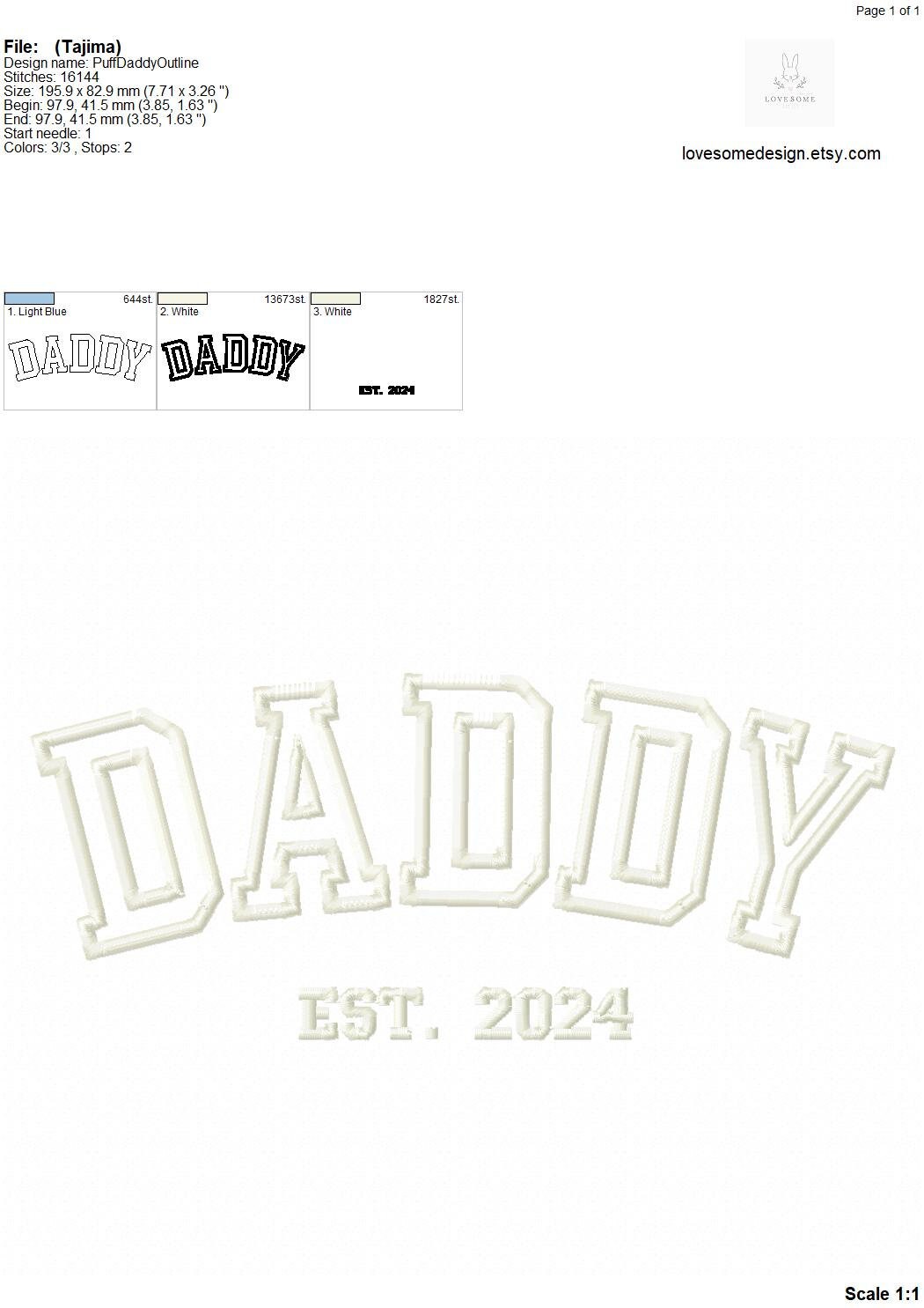 This listing features a machine embroidery design "DADDY est. 2024" for puff stitch embroidery in 8inch size.