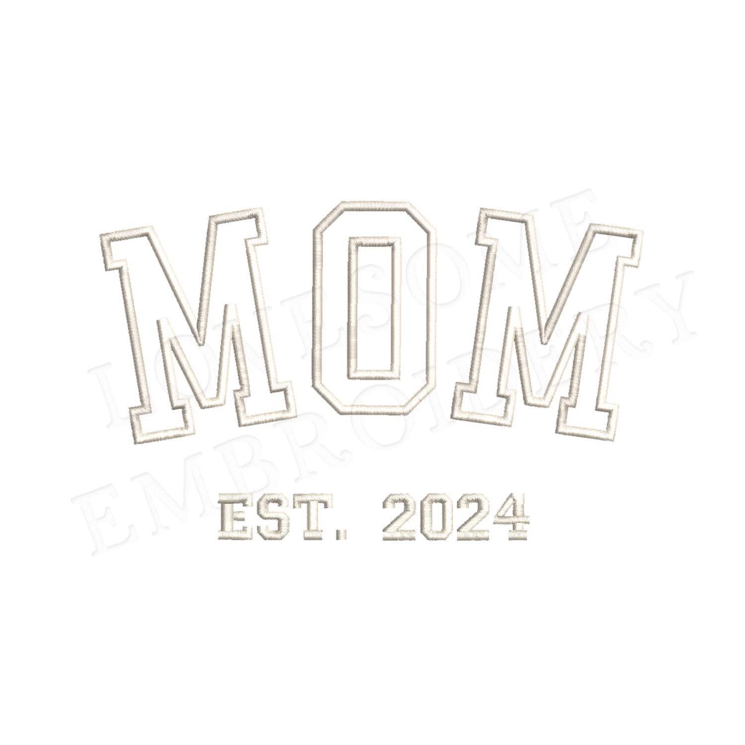 This listing features a machine embroidery design "MOM est. 2024" for puff stitch embroidery in 10inch size.