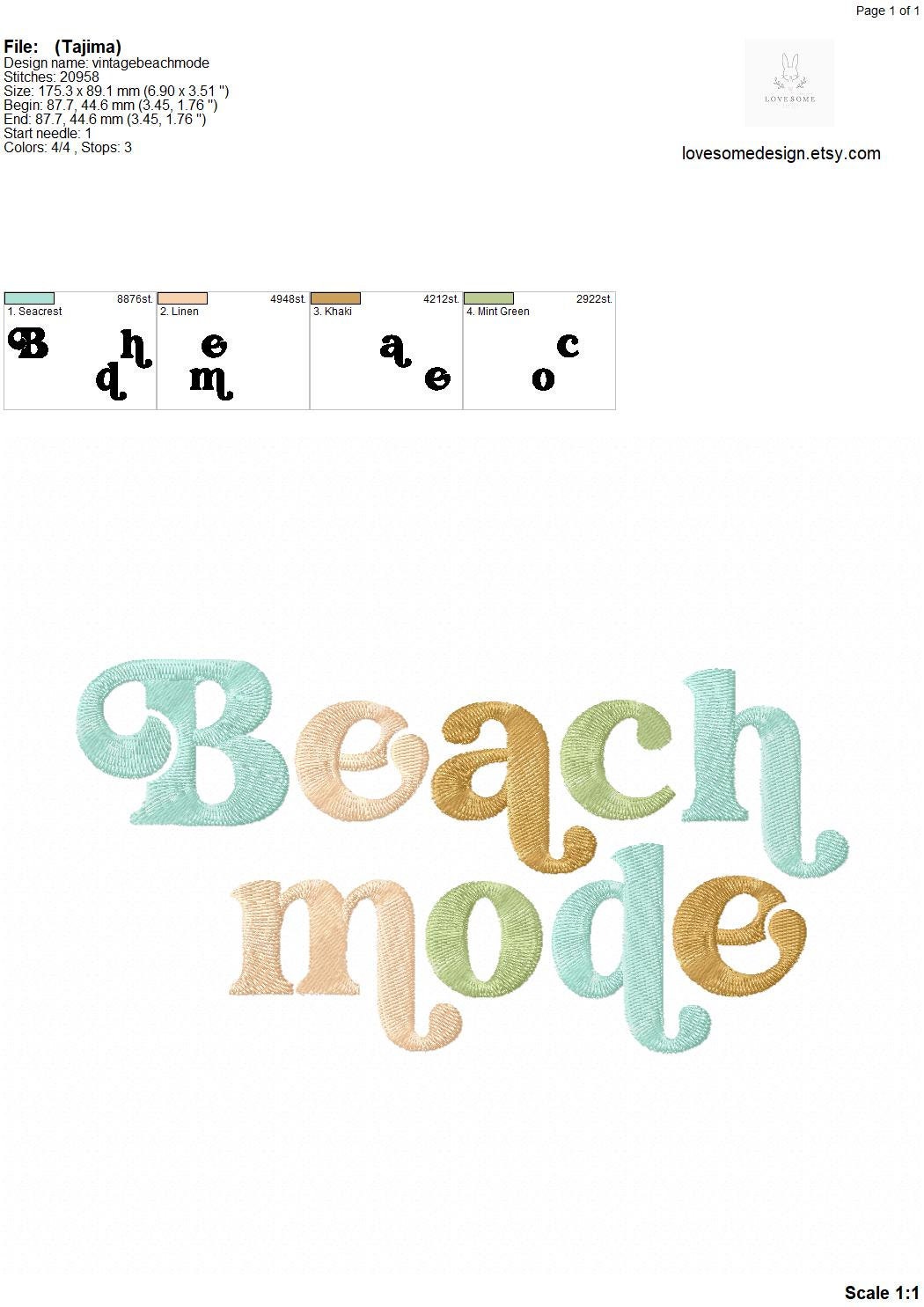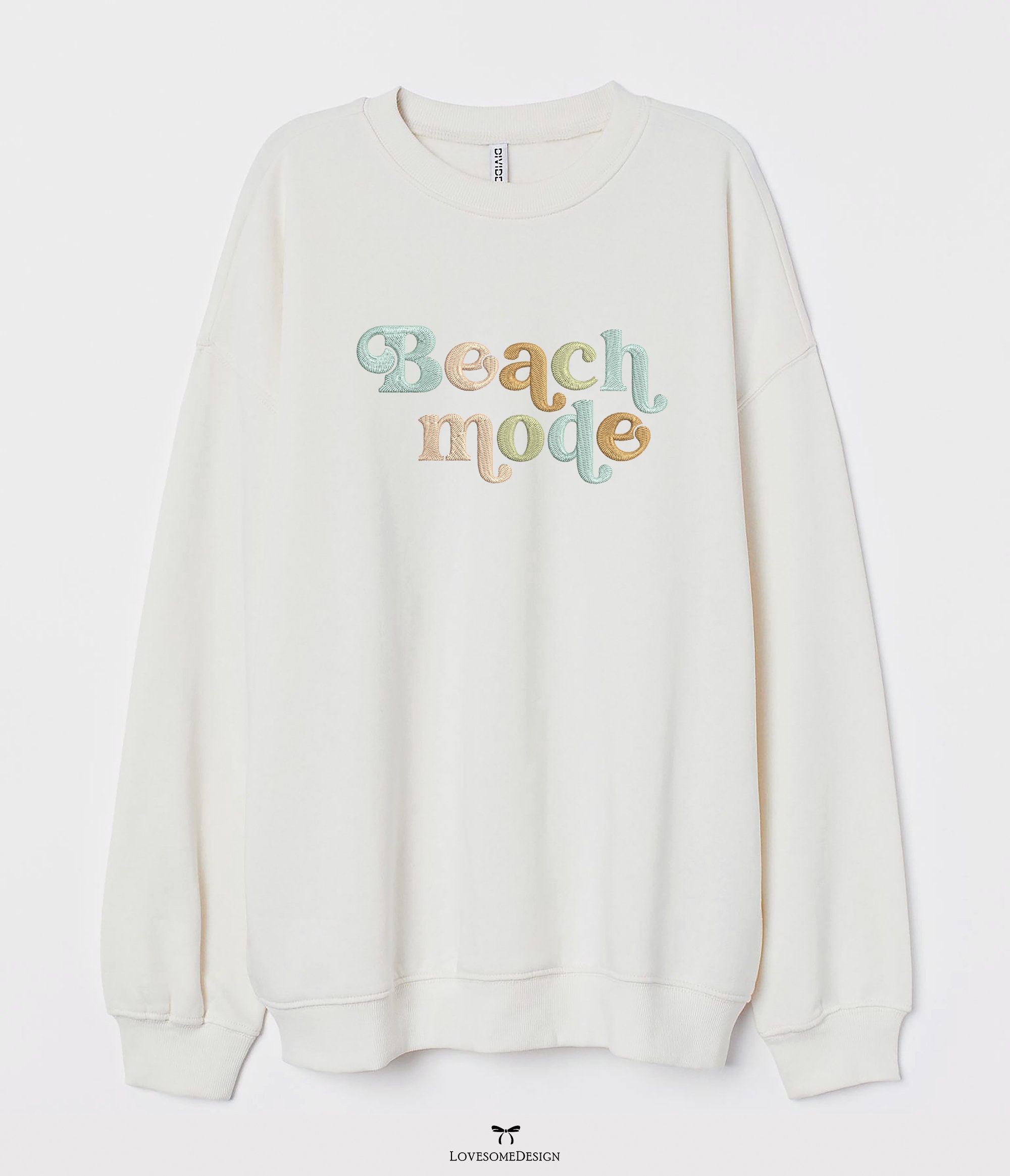 This listing features a machine embroidery design of lettering "Beach Mode" for retro style funky sweatshirt or groovy style tshirt embroidery in 8inch size.