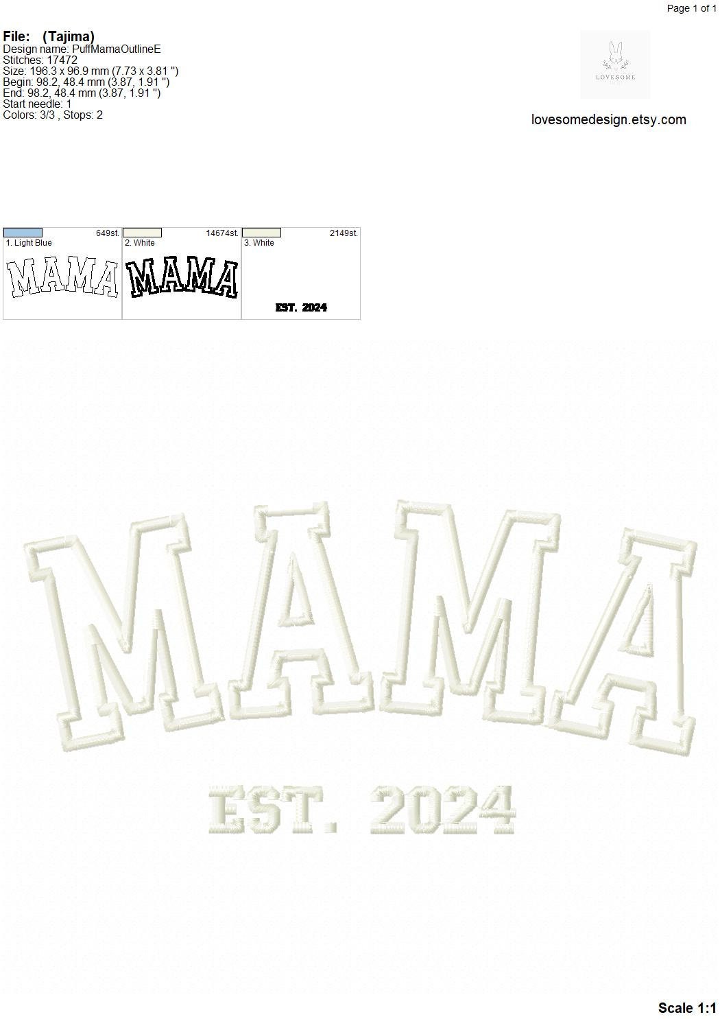 This listing features a machine embroidery design "MAMA est. 2024" for puff stitch embroidery in 8inch size.