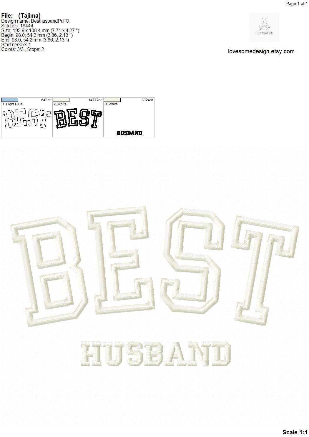 This listing features a machine embroidery design "BEST HUSBAND" for puff stitch embroidery in 8inch size.