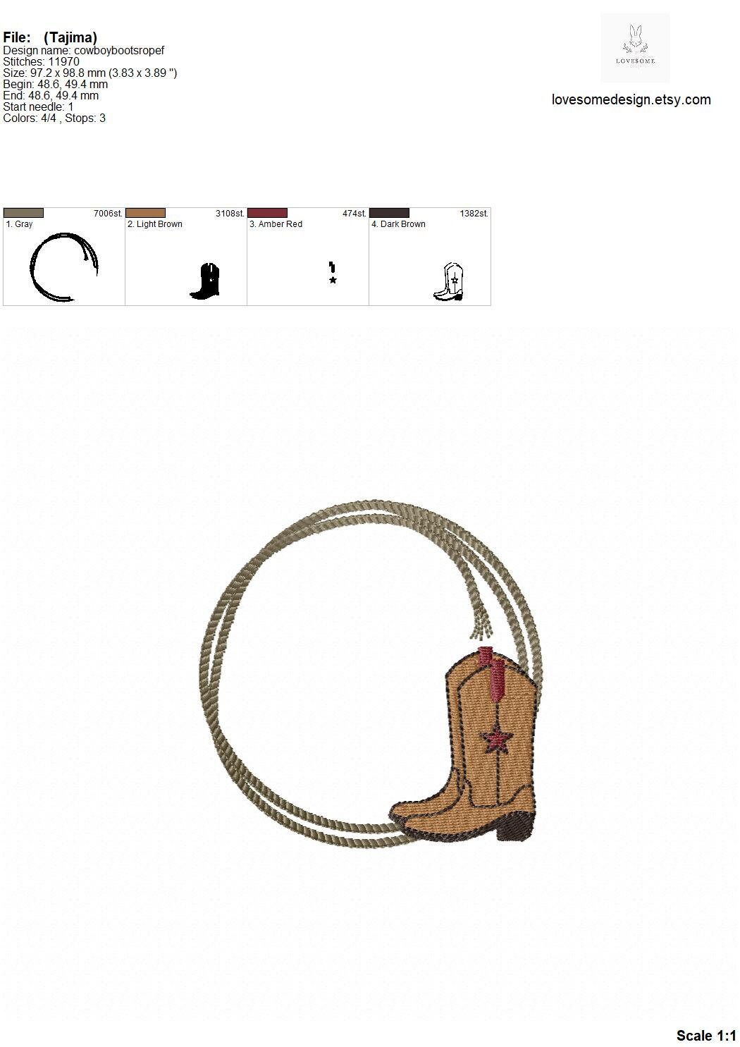This listing includes one cowboy rope frame with cowboy boots design for machine embroidery in 4inch size.