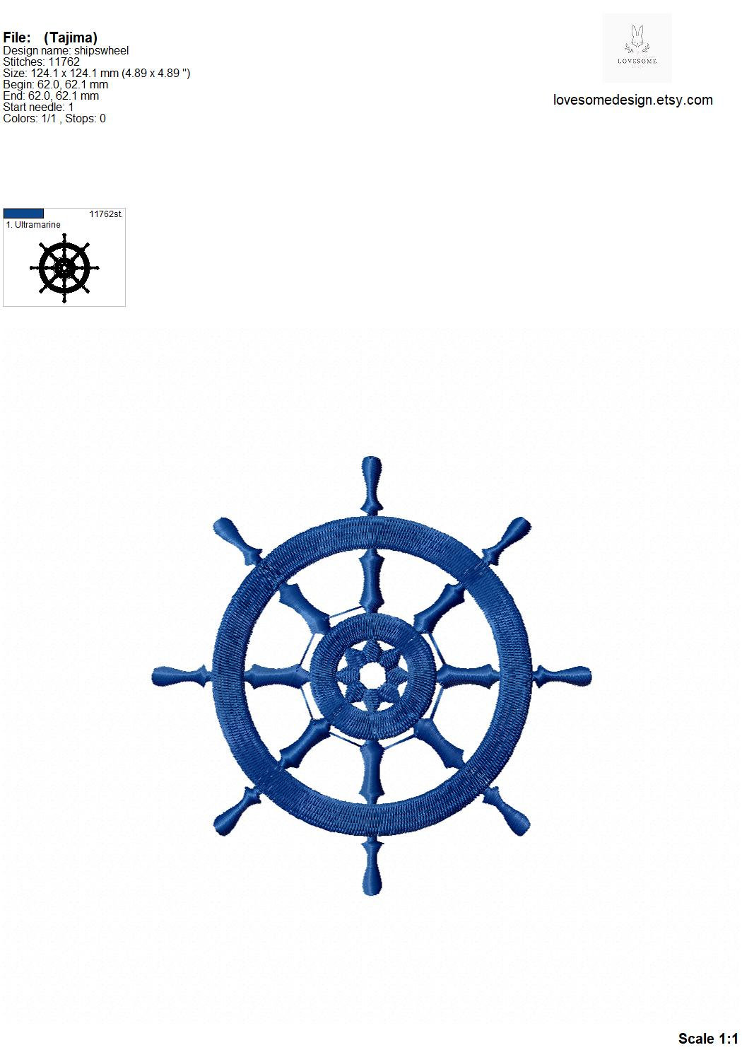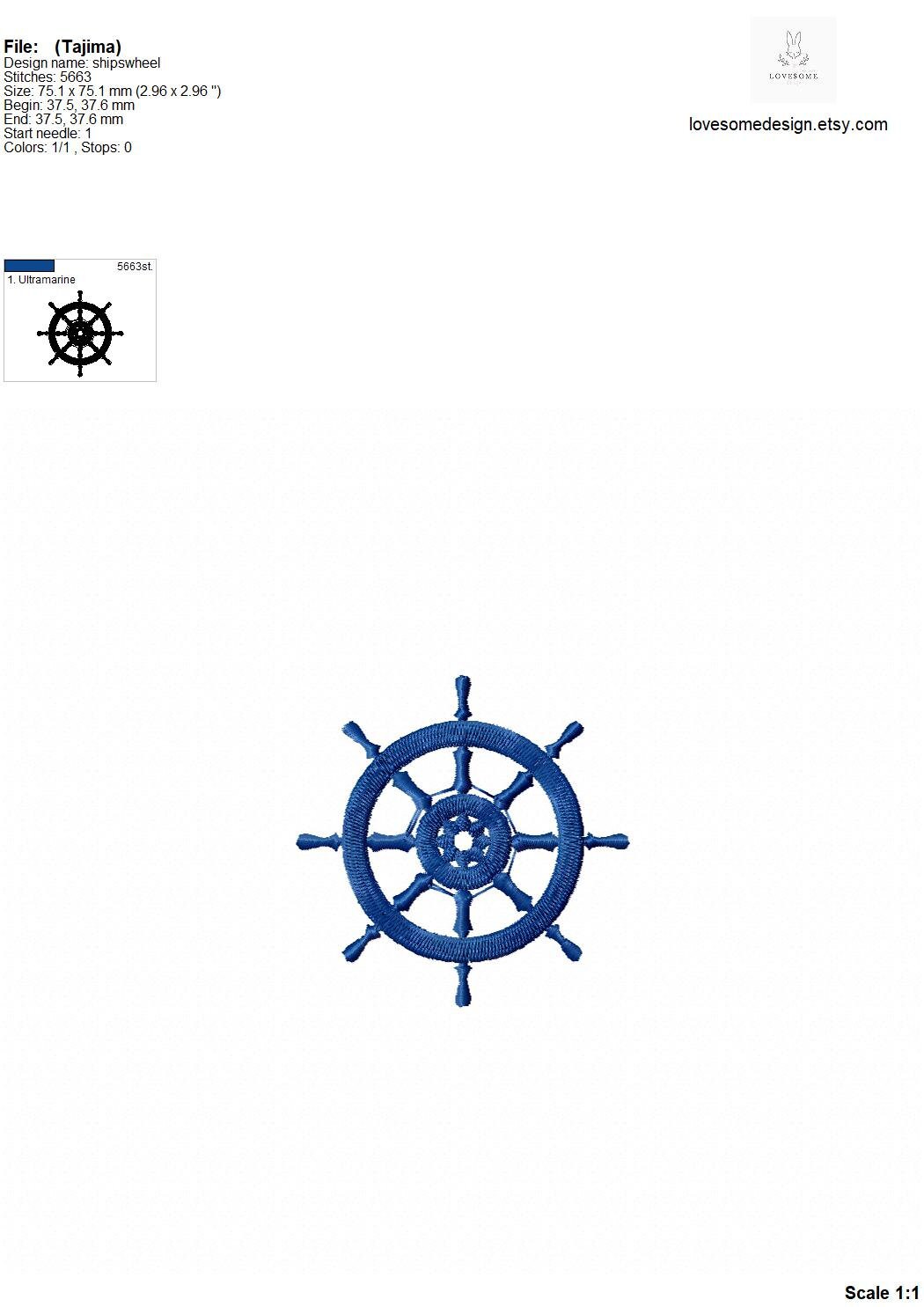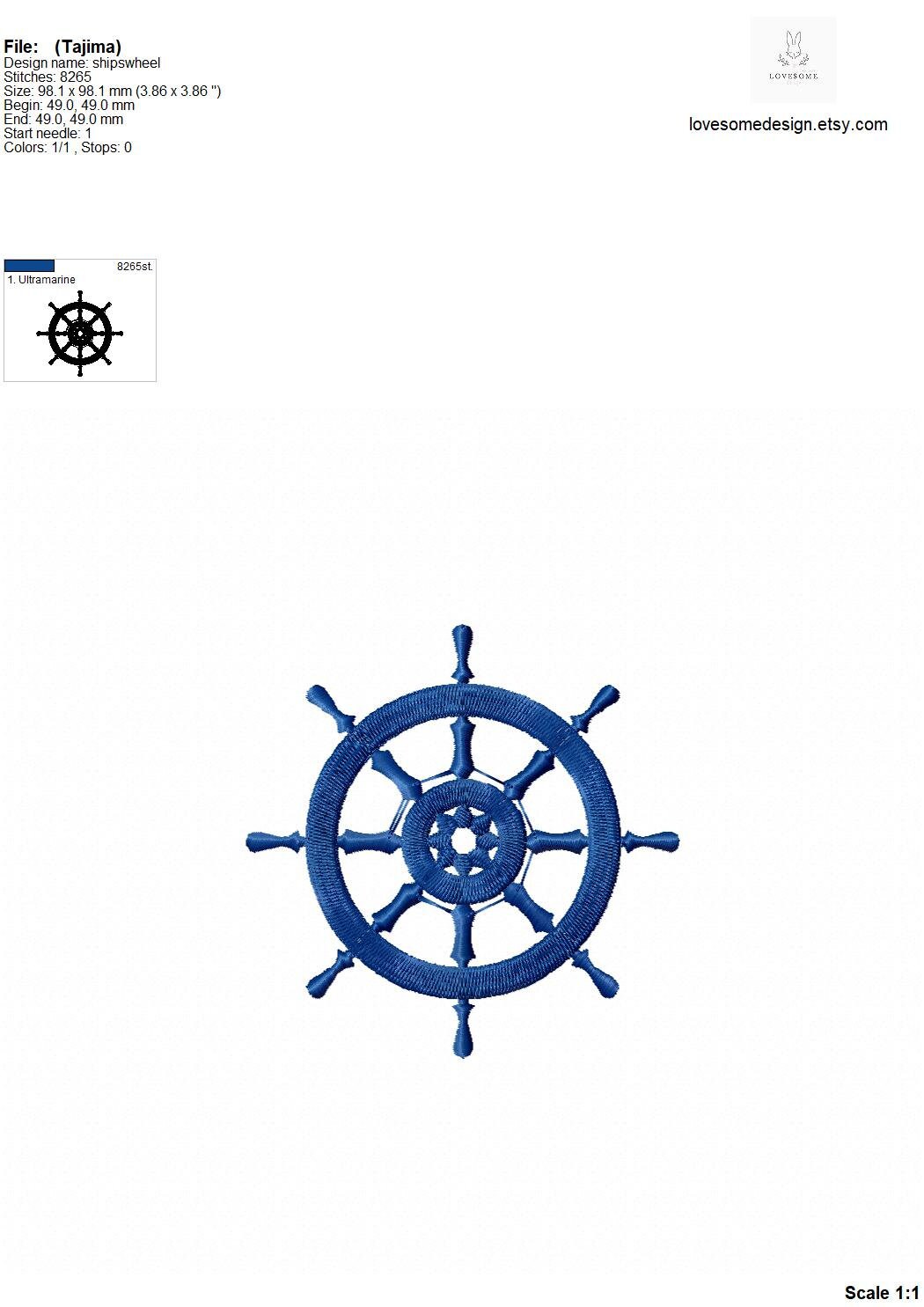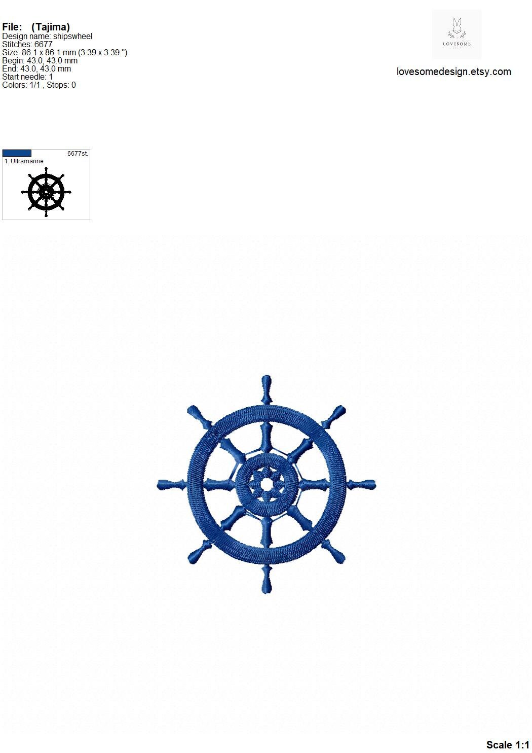 This listing includes one ships wheel design for machine embroidery in four sizes, in 5inch, 4inch, 3.5inch and 3inch for embroidery hoops 4x4 and bigger.