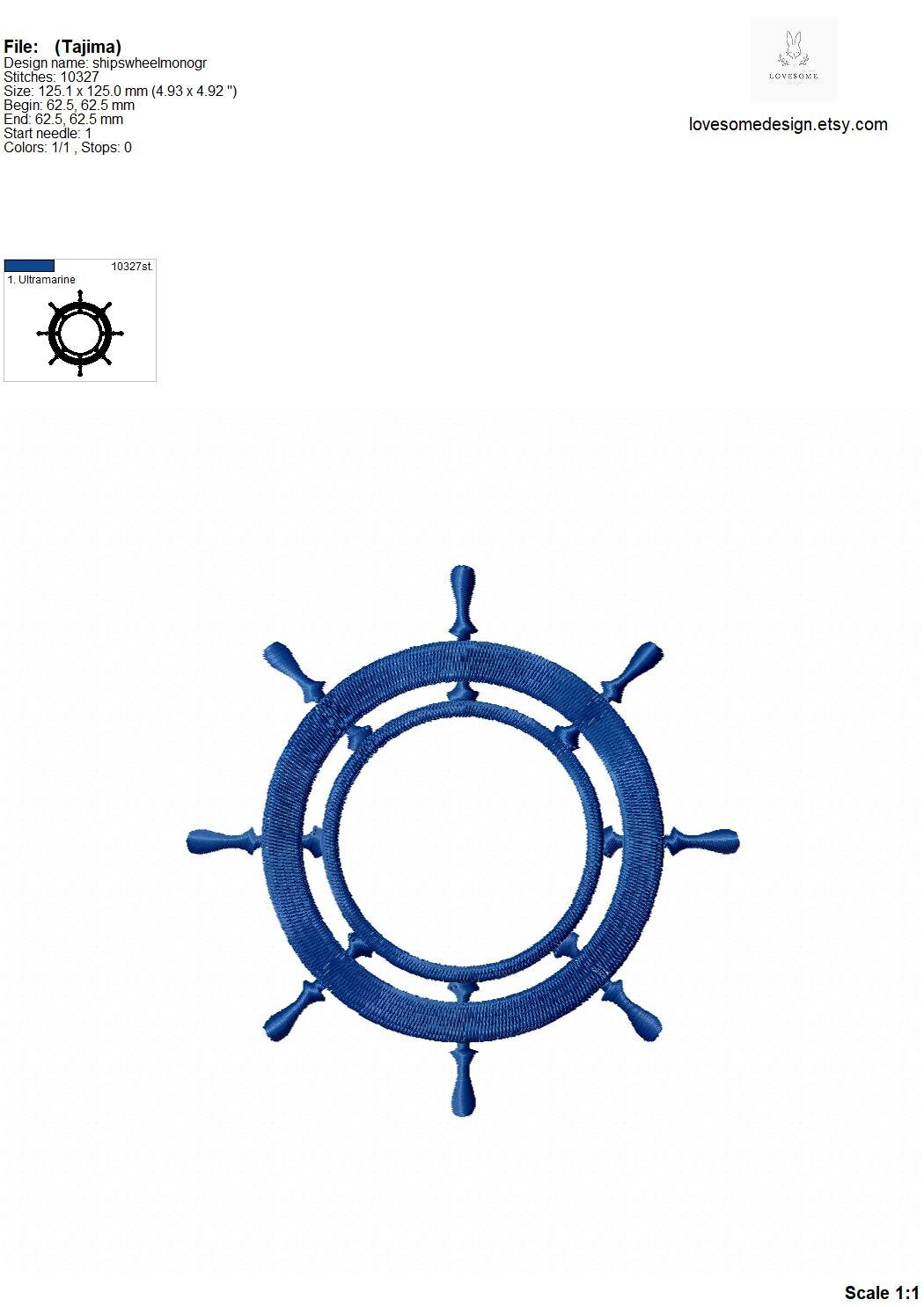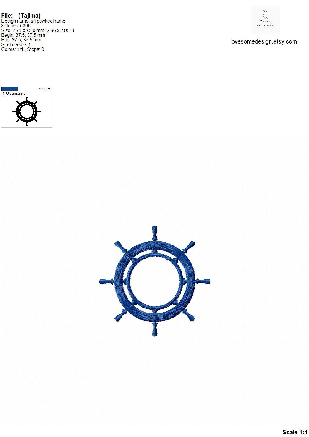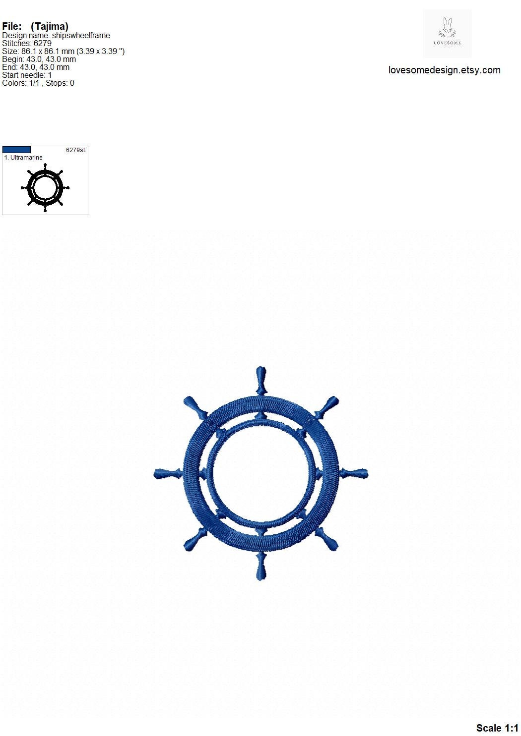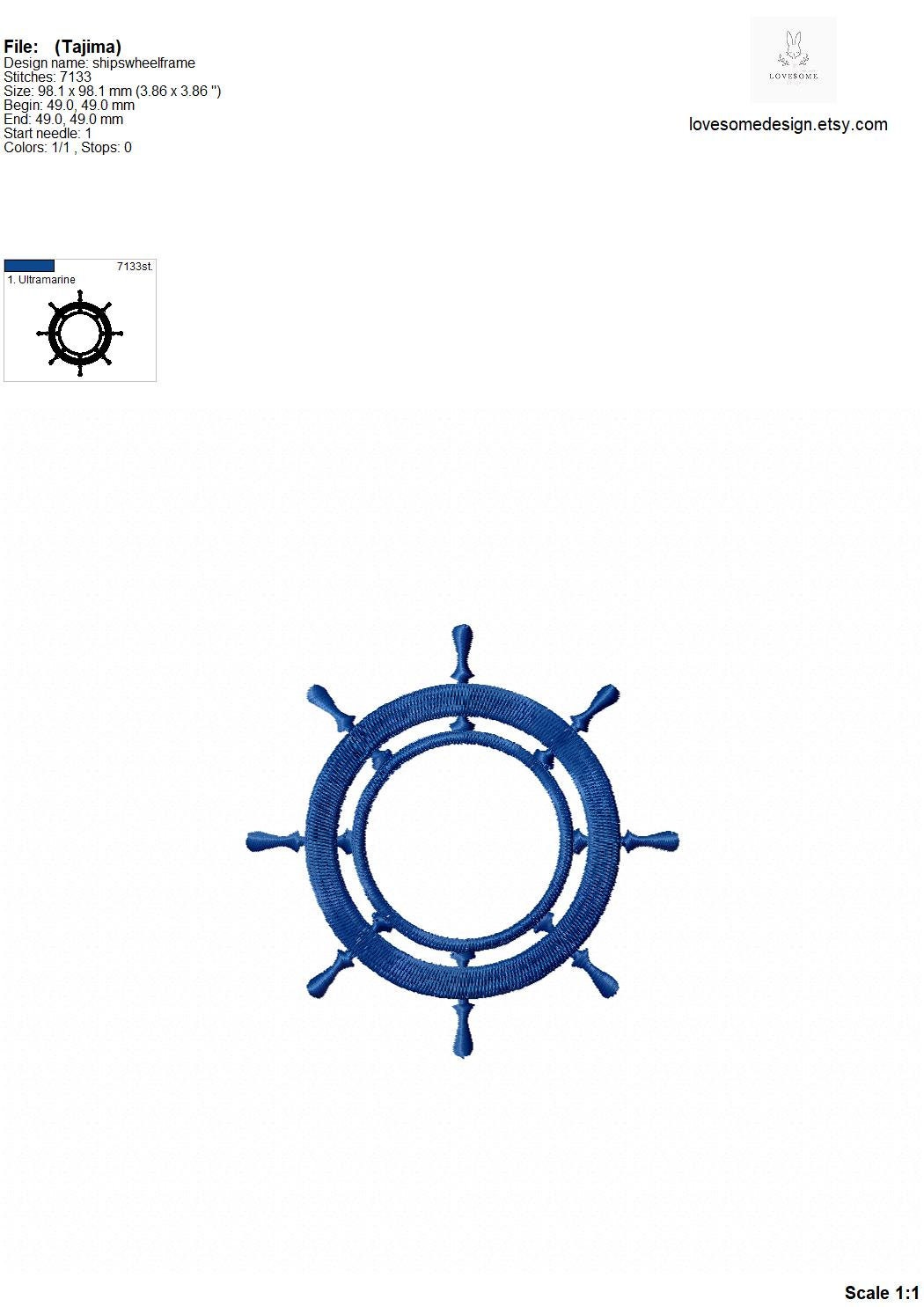 This listing includes one ships wheel frame design for machine embroidery in four sizes, in 5inch, 4inch, 3.5inch and 3inch for embroidery hoops 4x4 and bigger.