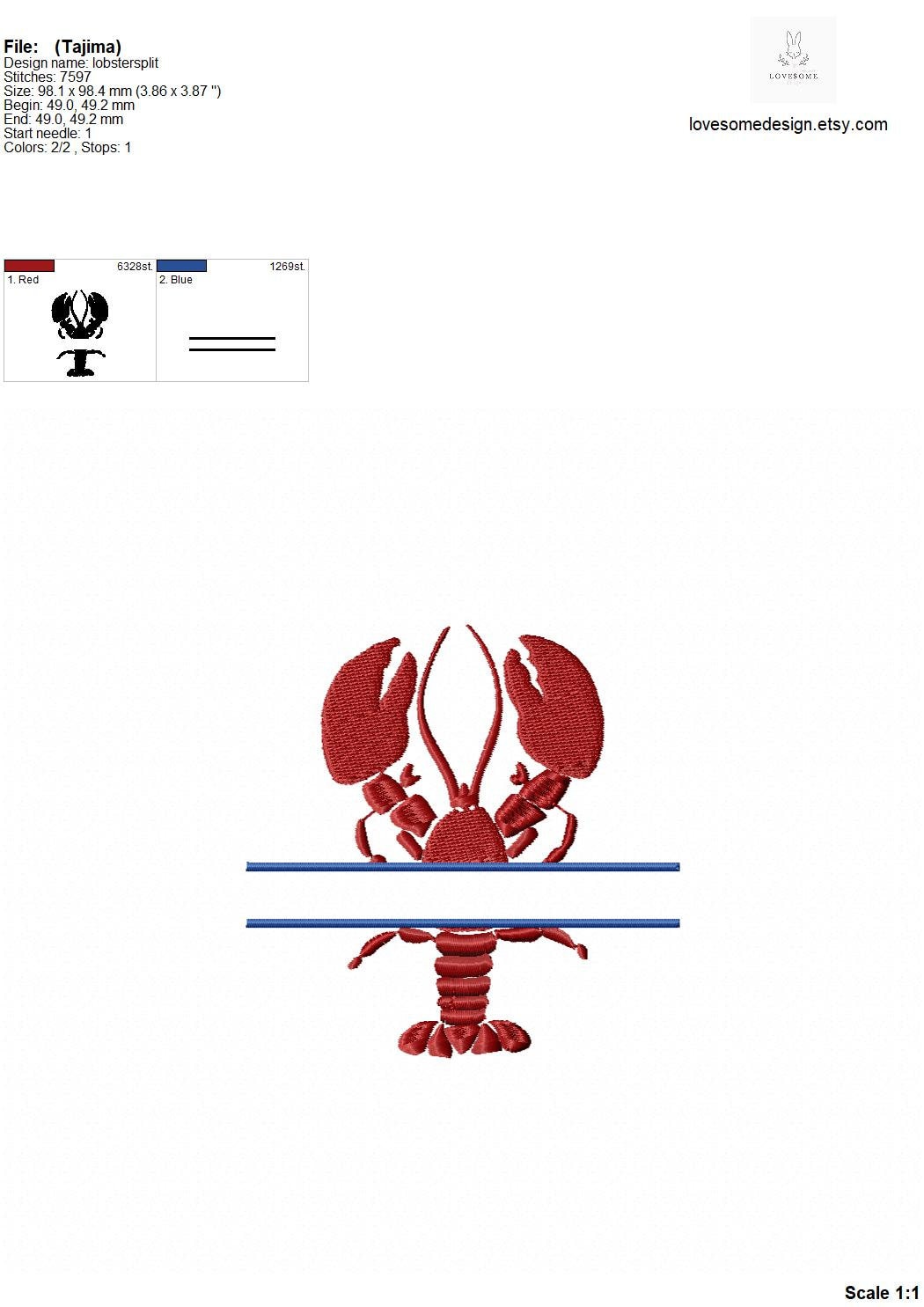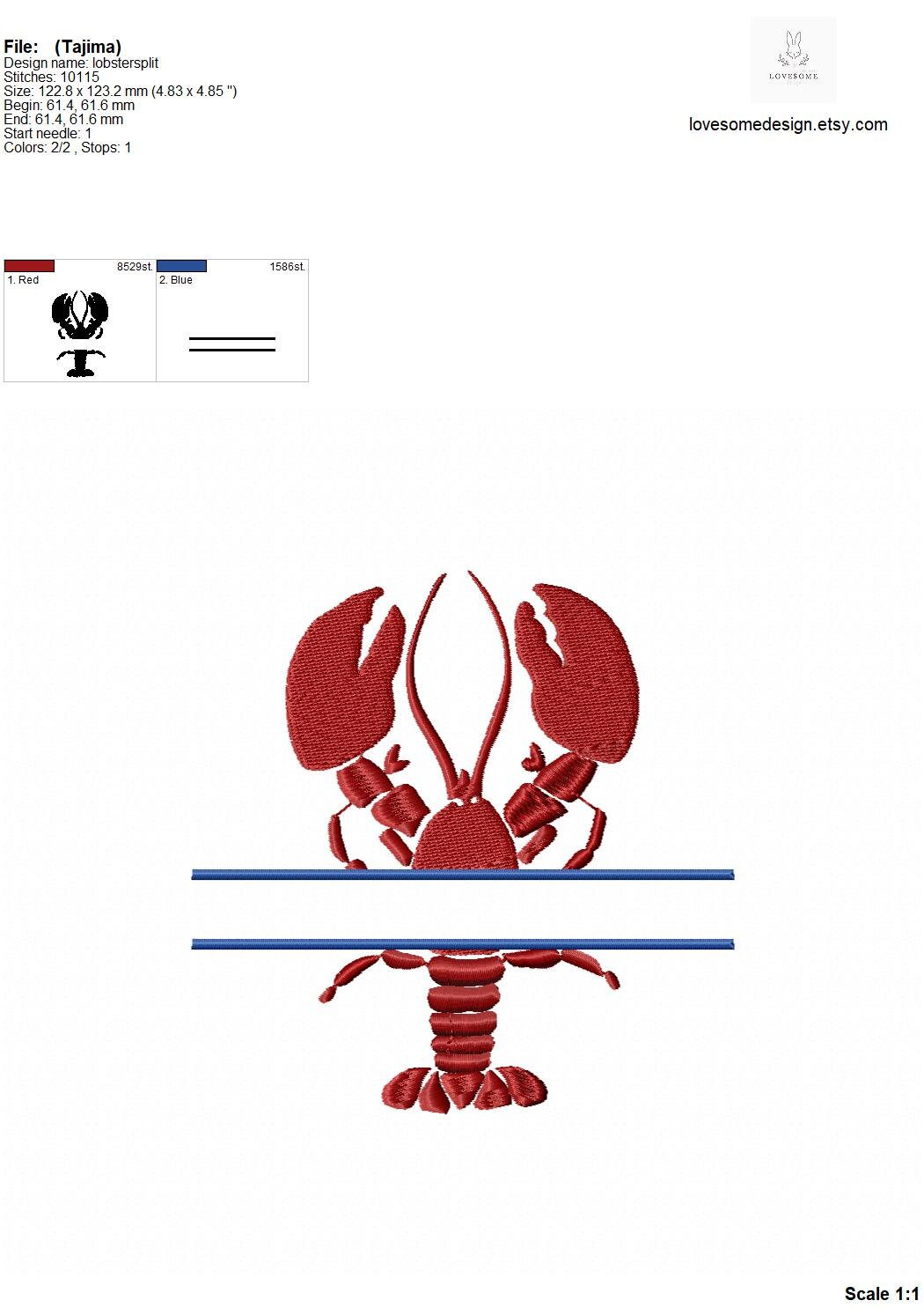 This listing includes one split lobster design for machine embroidery in two sizes, each appr. in 4inch and 5inch.