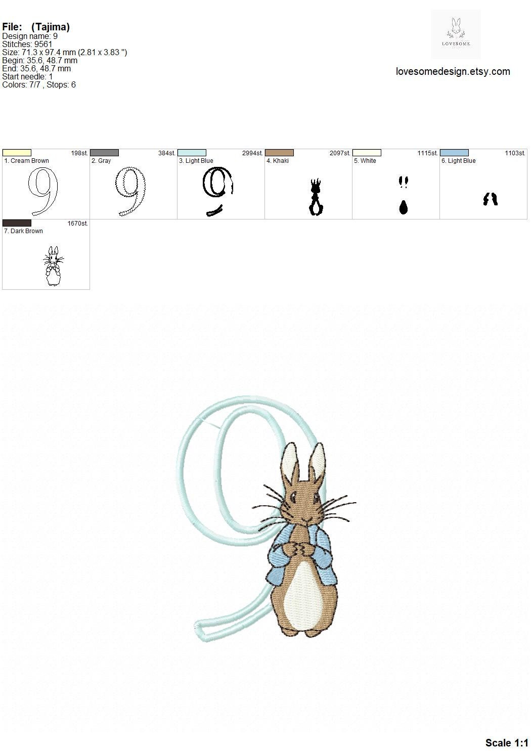This listing features a machine embroidery numbers set which includes embroidery files of ten applique numbers (0-9) with Peter Rabbit design in one size for 4x4 hoops for machine embroidery. (For the whole set, pls see the listing images.)