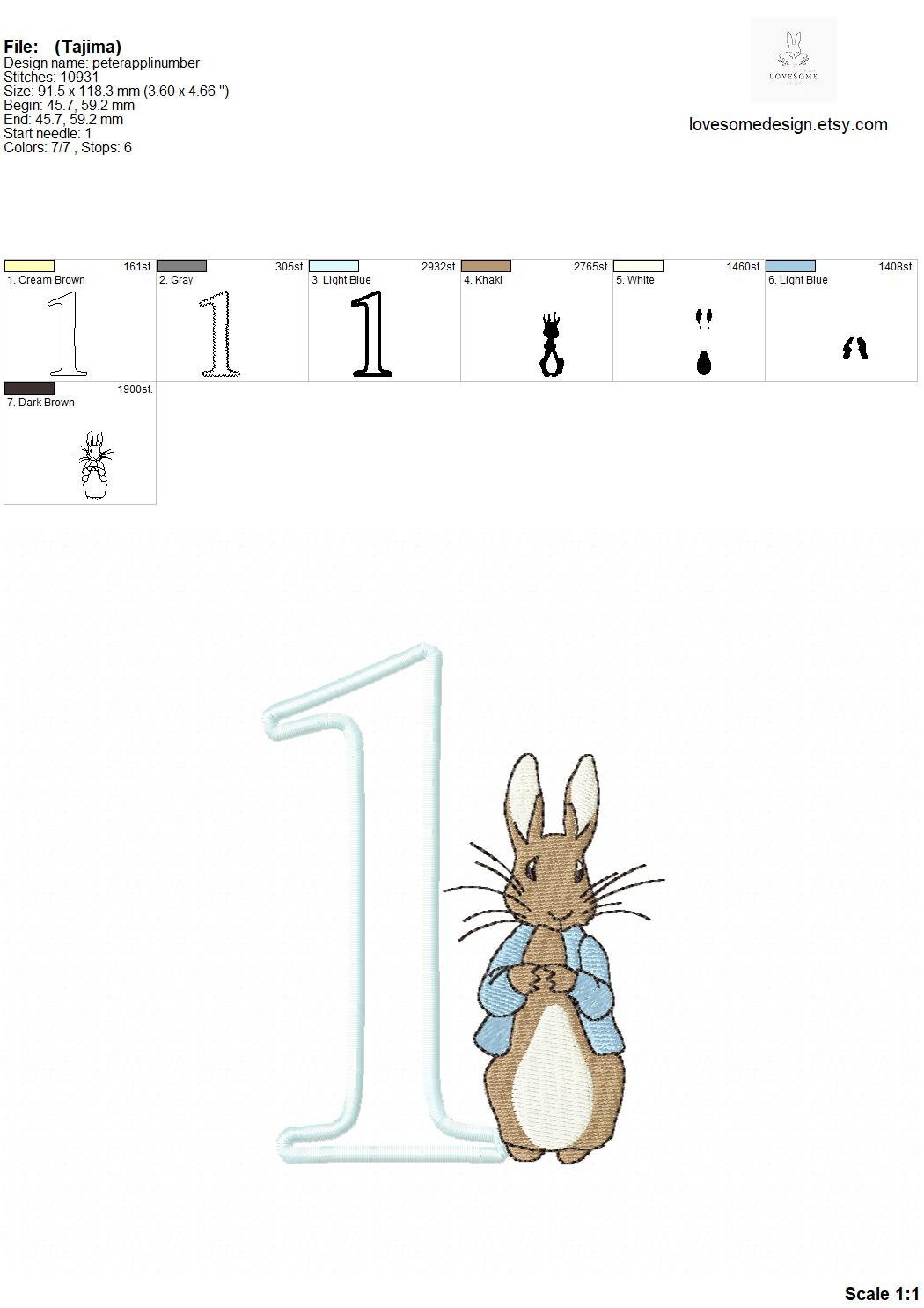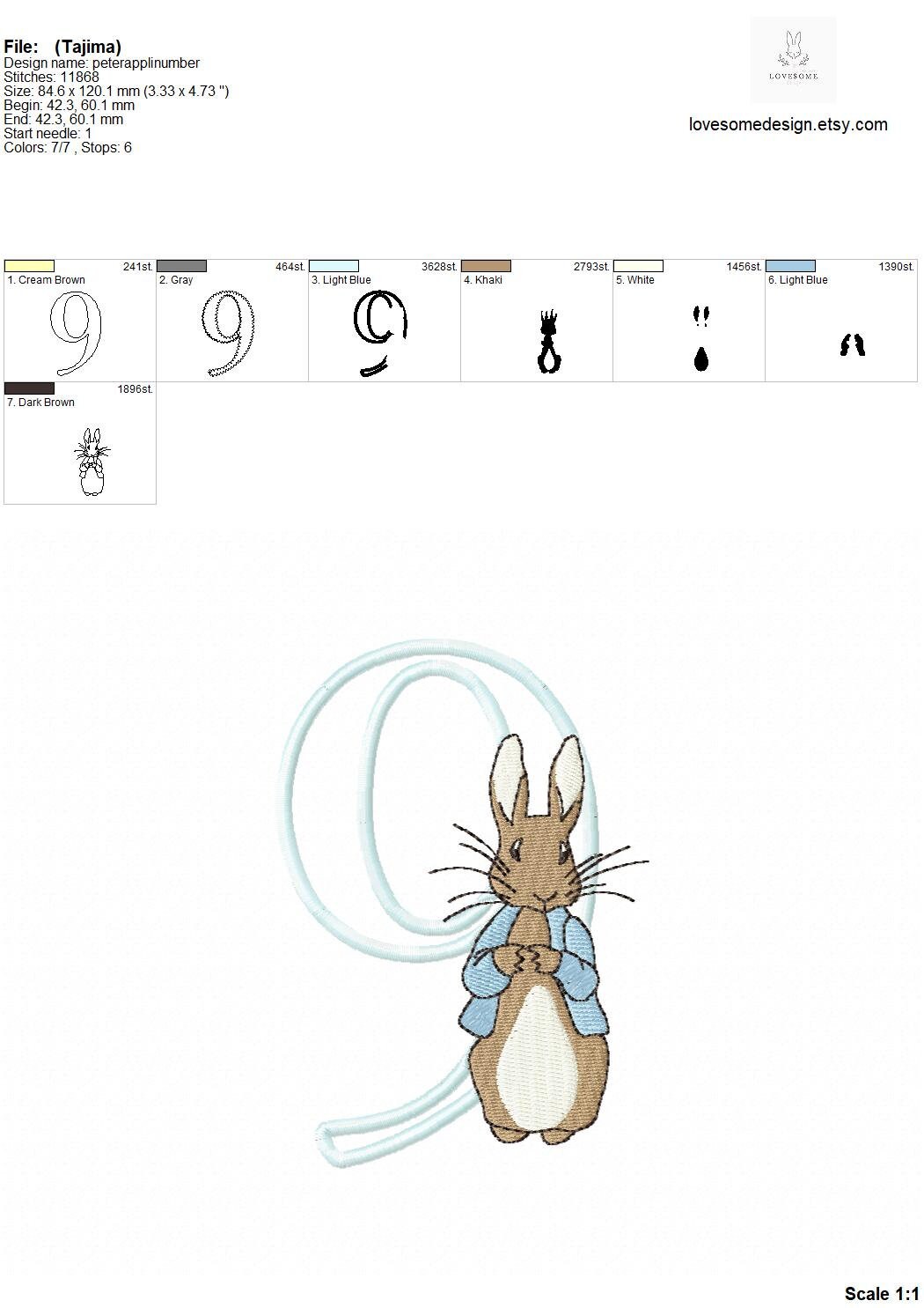 This listing features a machine embroidery numbers set which includes embroidery files of ten applique numbers (0-9) with Peter Rabbit design in one size 5inch for machine embroidery. (For the whole set, pls see the listing images.)