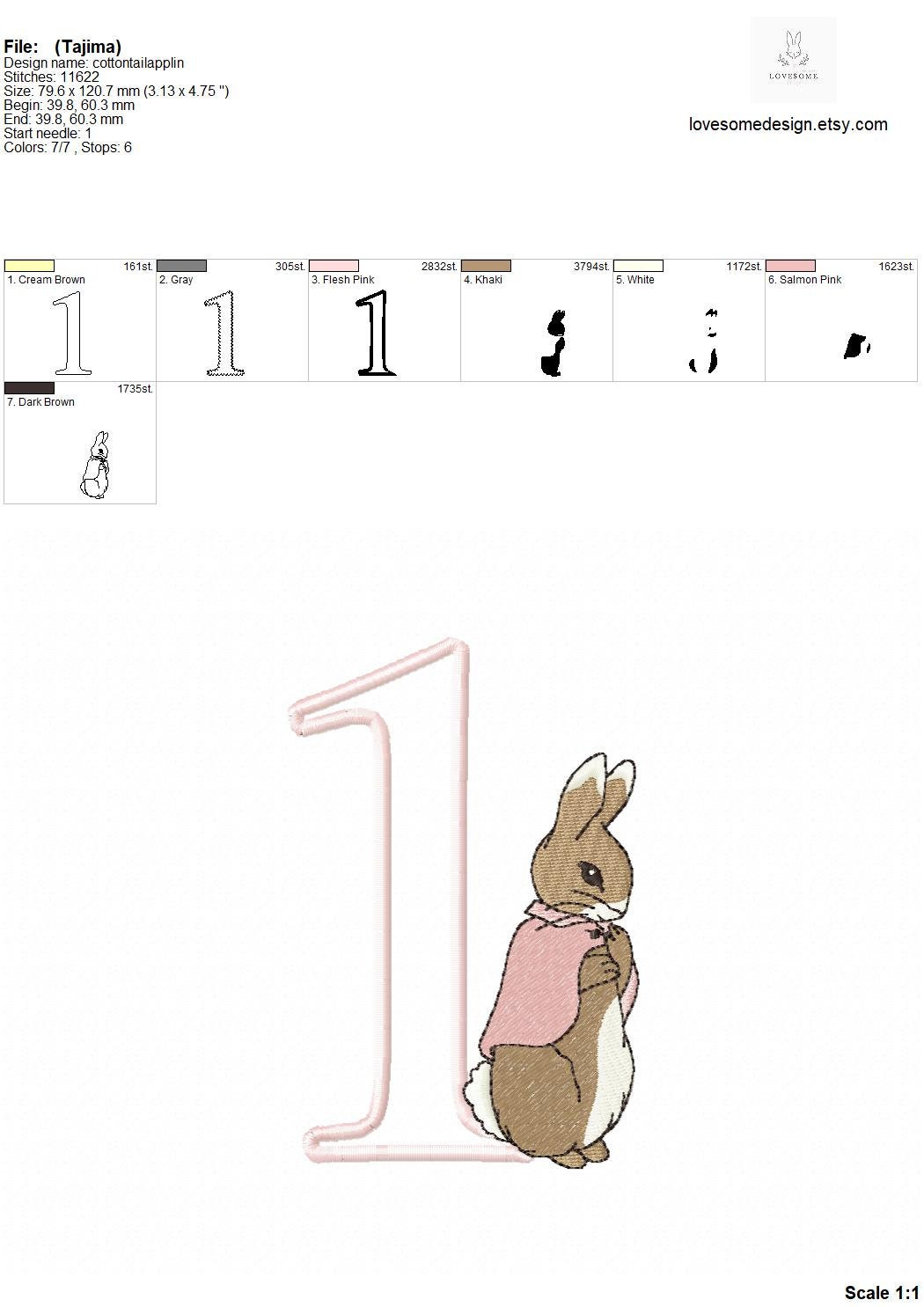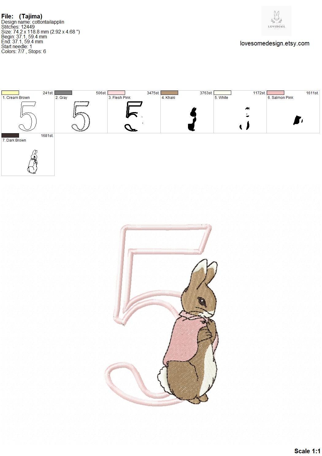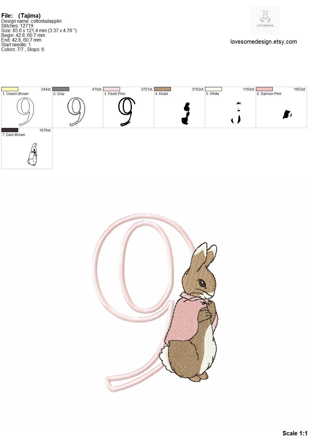 This listing features a machine embroidery numbers set which includes embroidery files of ten applique numbers (0-9) with Cottontail Rabbit design in one size 5inch for machine embroidery. (For the whole set, pls see the listing images.)