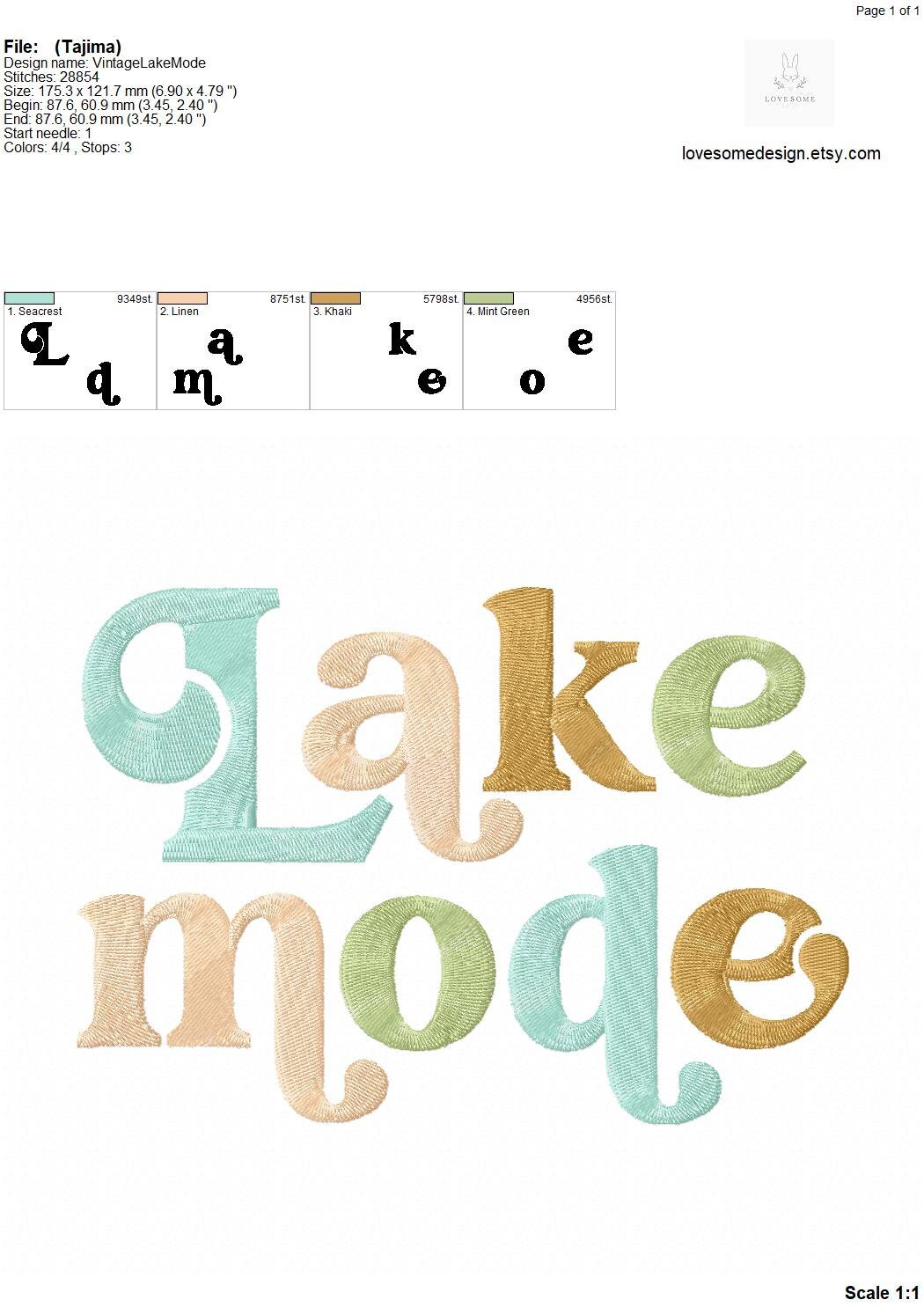 This listing features a machine embroidery design of lettering "Lake Mode" for retro style funky sweatshirt or groovy style tshirt embroidery in 7inch size.