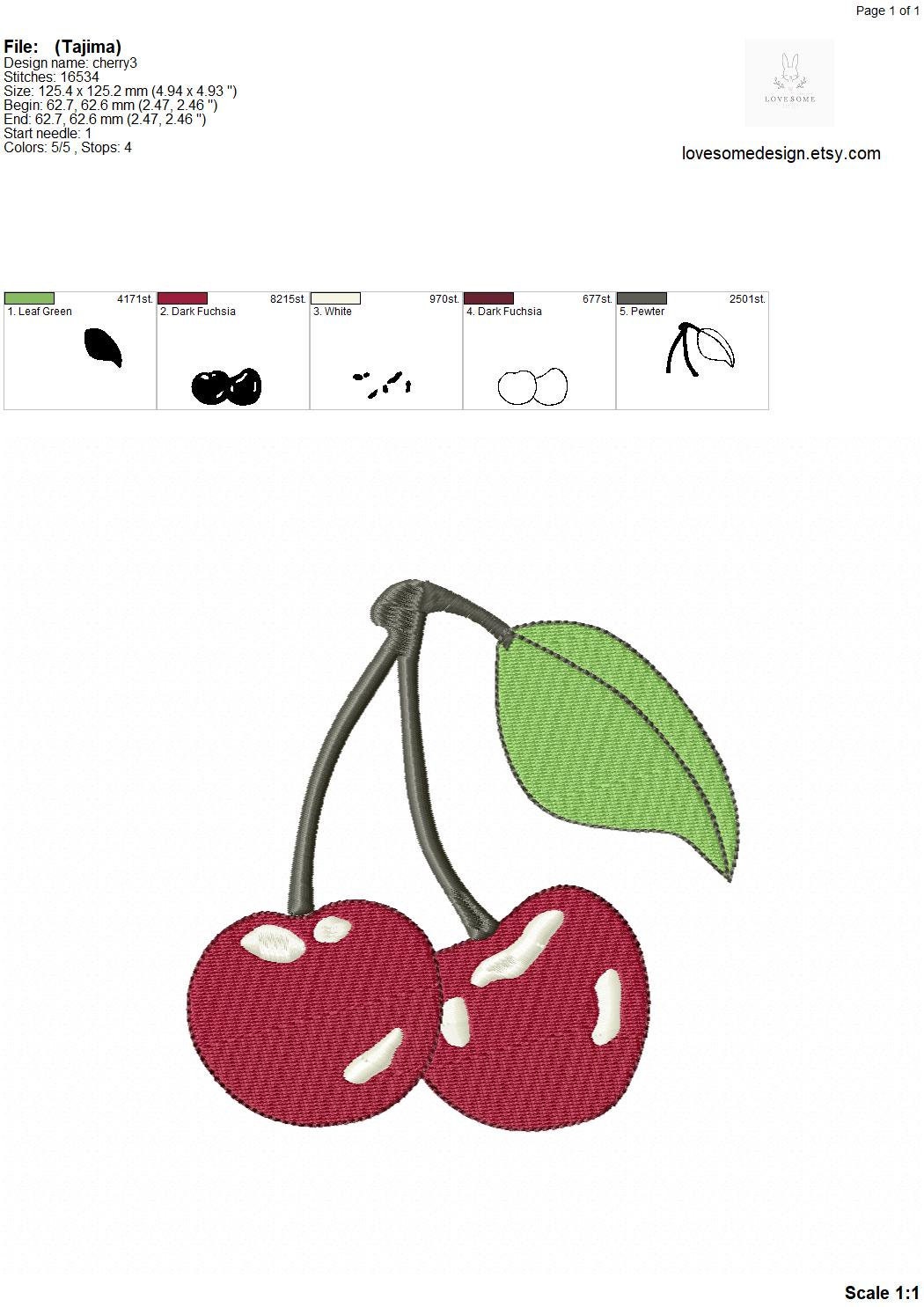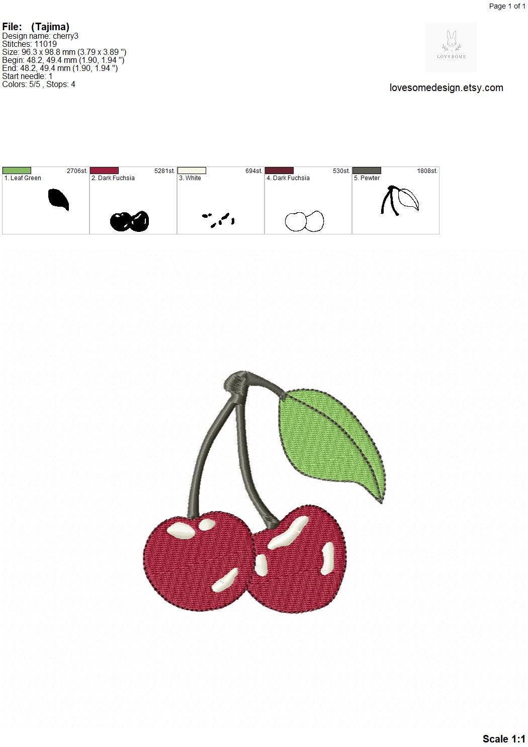 This listing includes one cute cherry design for machine embroidery in two sizes, appr. 4inch and 5inch size for embroidery hoops in different sizes.