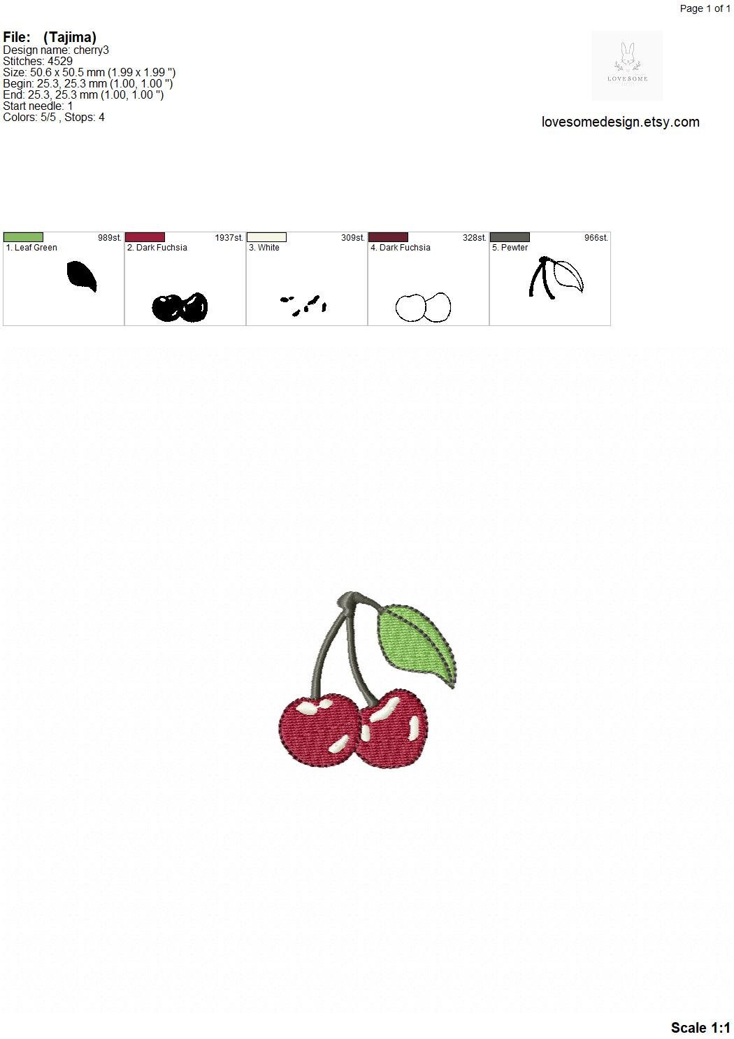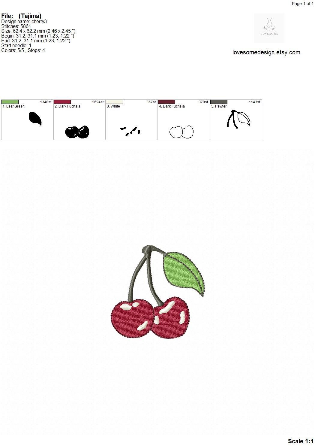 This listing includes one cute cherry design for machine embroidery in two sizes, appr. 2inch and 2.5inch size for embroidery hoops in different sizes.