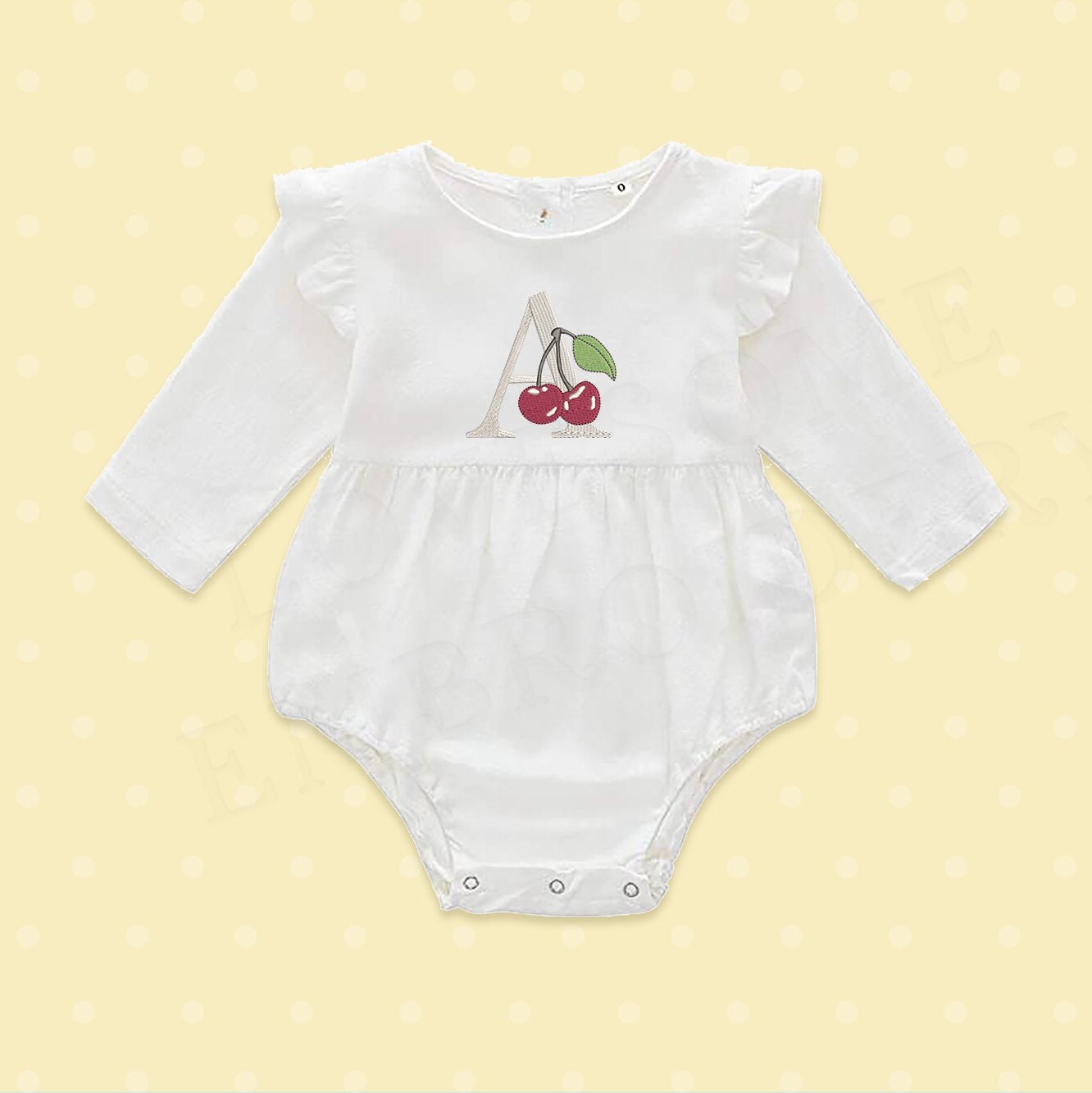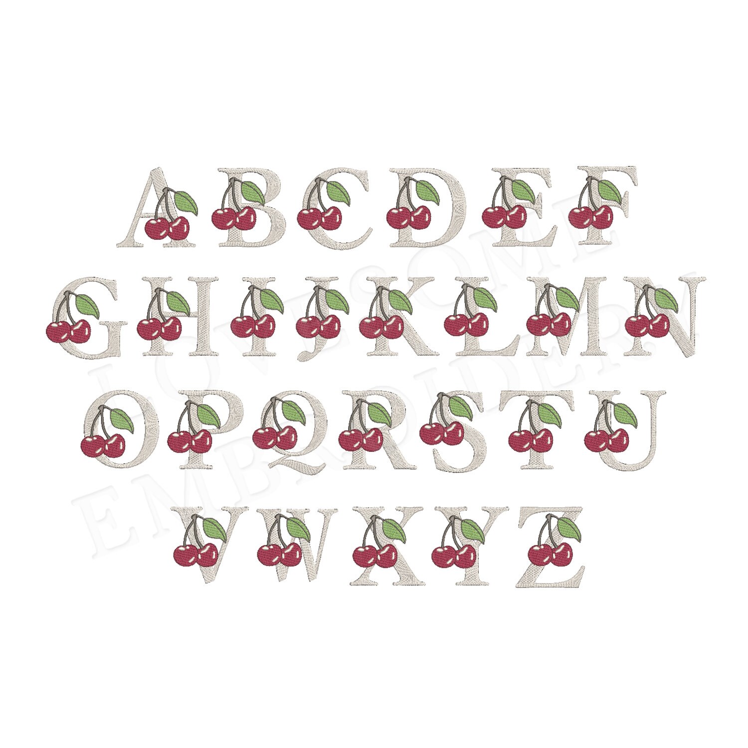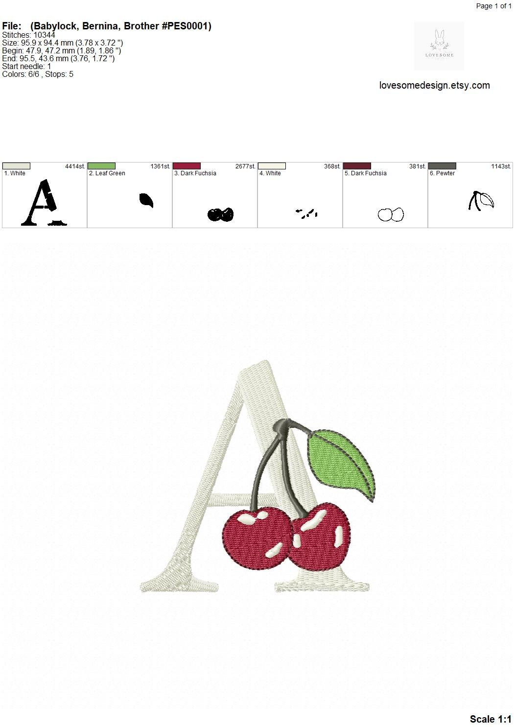 This listing features a machine embroidery font set which includes embroidery files of 26 uppercase embroidery letters with beautiful cherry design in 4inch size. (For the whole set, pls see the listing images.)