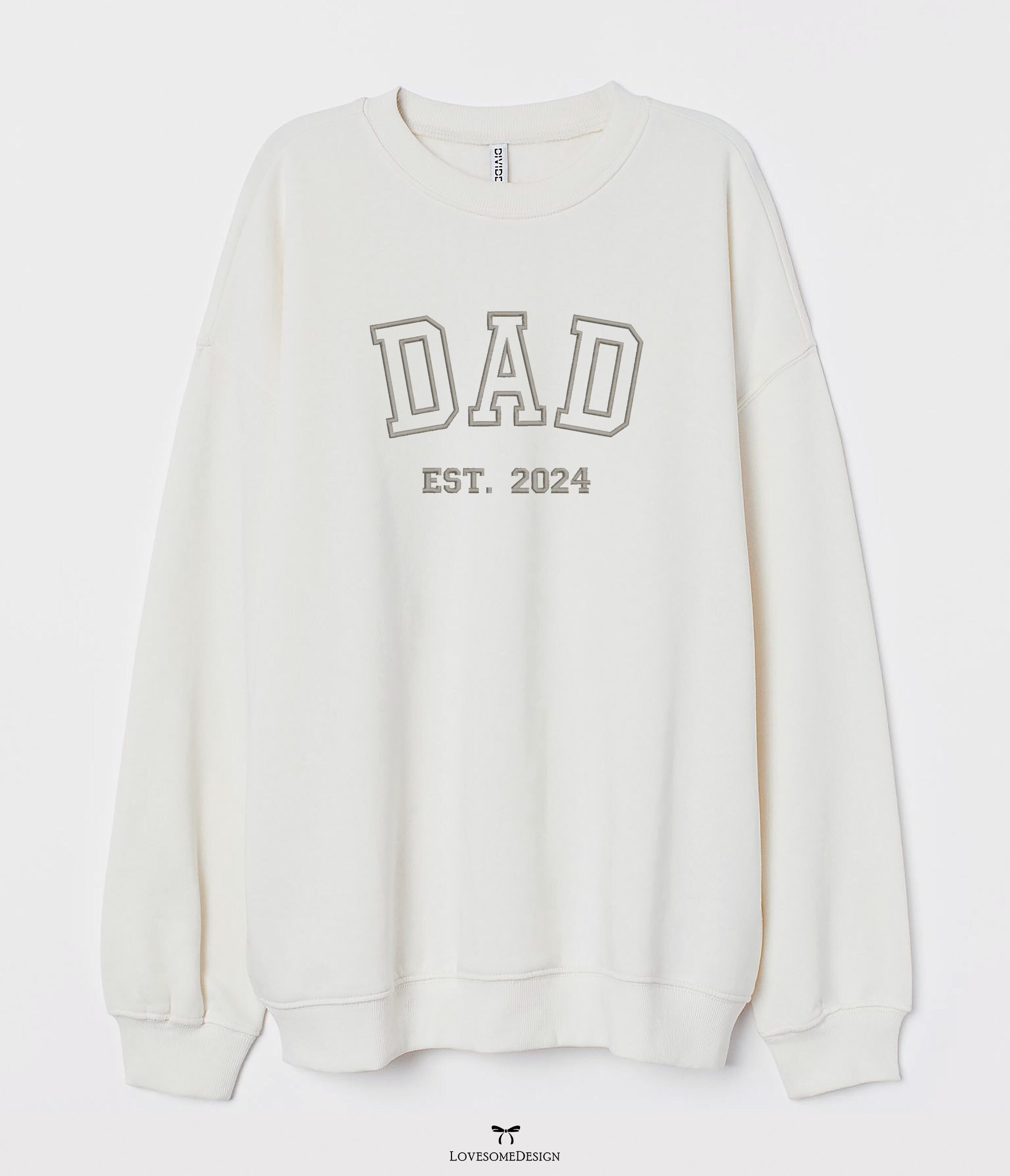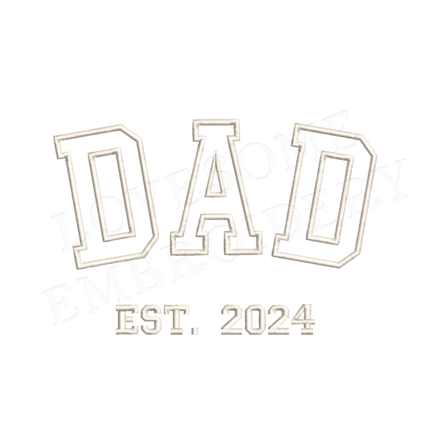 This listing features a machine embroidery design "DAD est. 2024" for puff stitch embroidery in 10inch size.