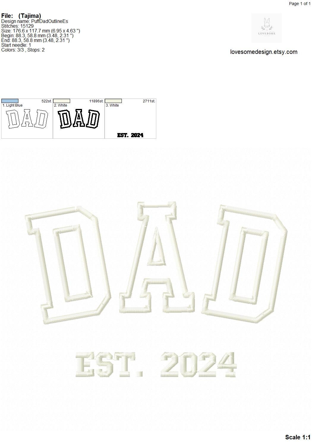 This listing features a machine embroidery design "DAD est. 2024" for puff stitch embroidery in 7inch size.