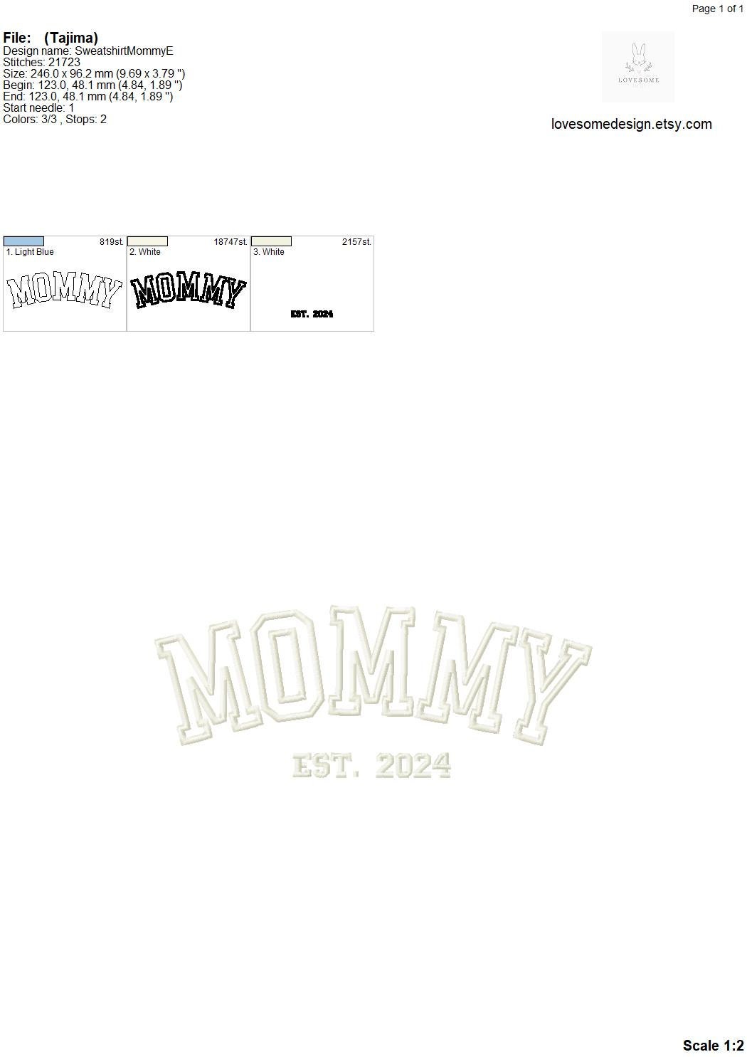 This listing features a machine embroidery design "MOMMY est. 2024" for puff stitch embroidery in 10inch size.