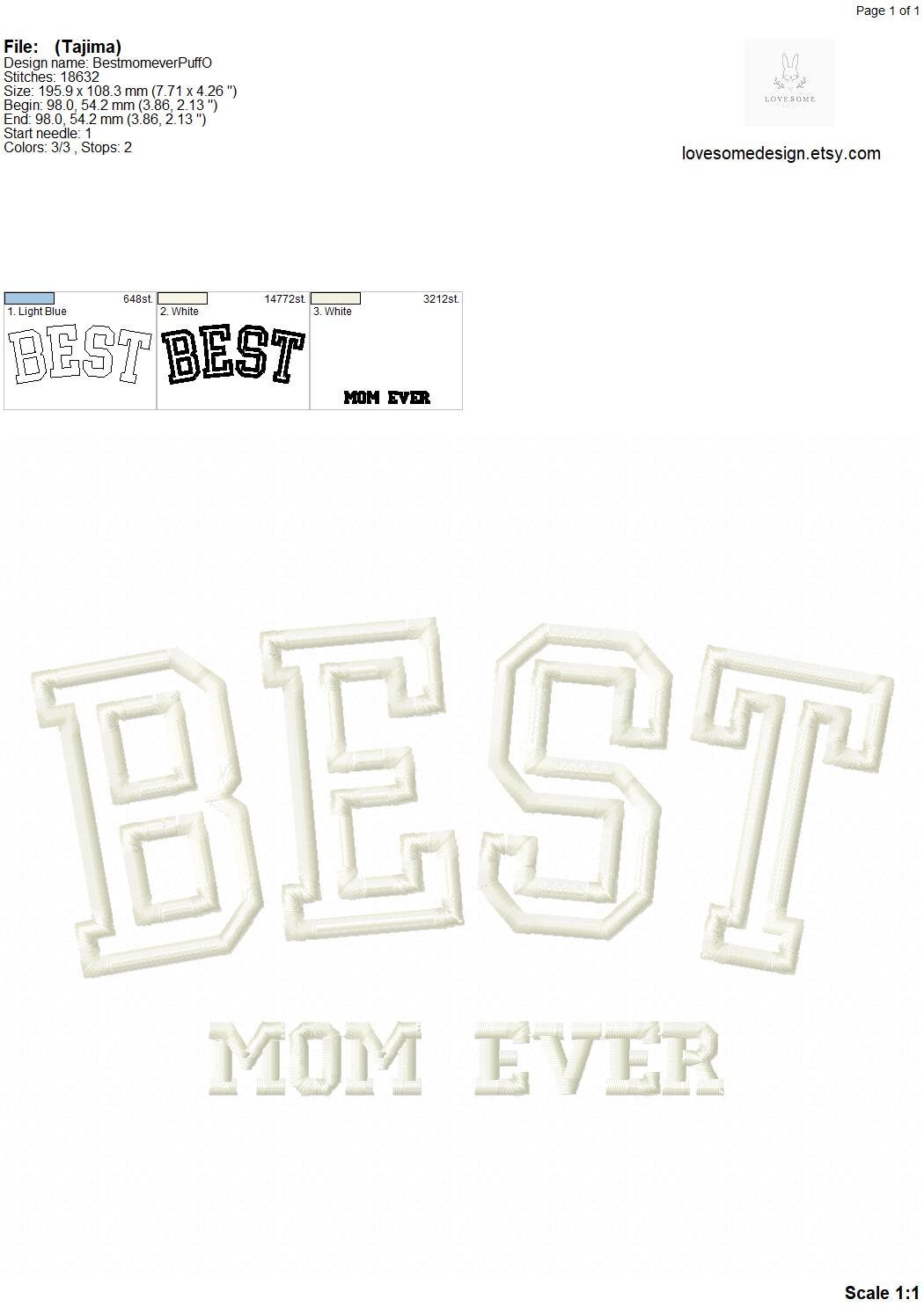 This listing features a machine embroidery design "BEST MOM EVER" for puff stitch embroidery in 8inch size.