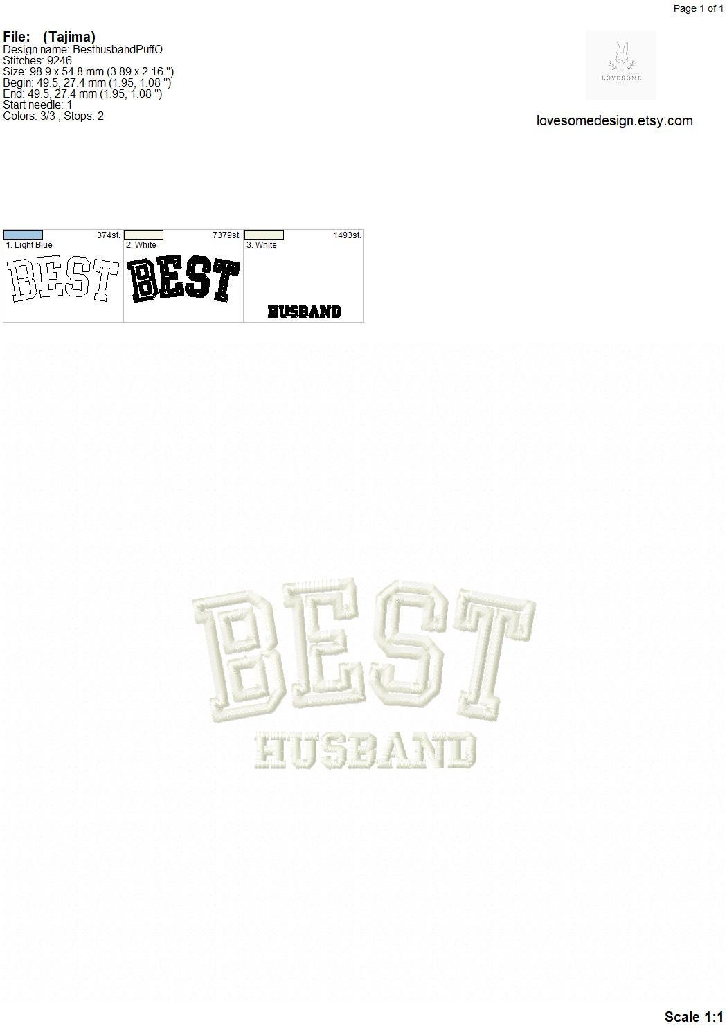 This listing features a machine embroidery design "BEST HUSBAND" for puff stitch embroidery in 4inch size.