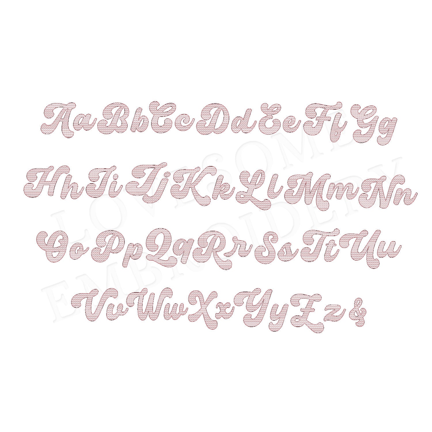 This listing features a machine embroidery retro font set which includes quick stitch groovy embroidery files of 26 uppercase, 26 lowercase letters and an ampersand in 3inch size. (For the whole set, pls see the listing images.)