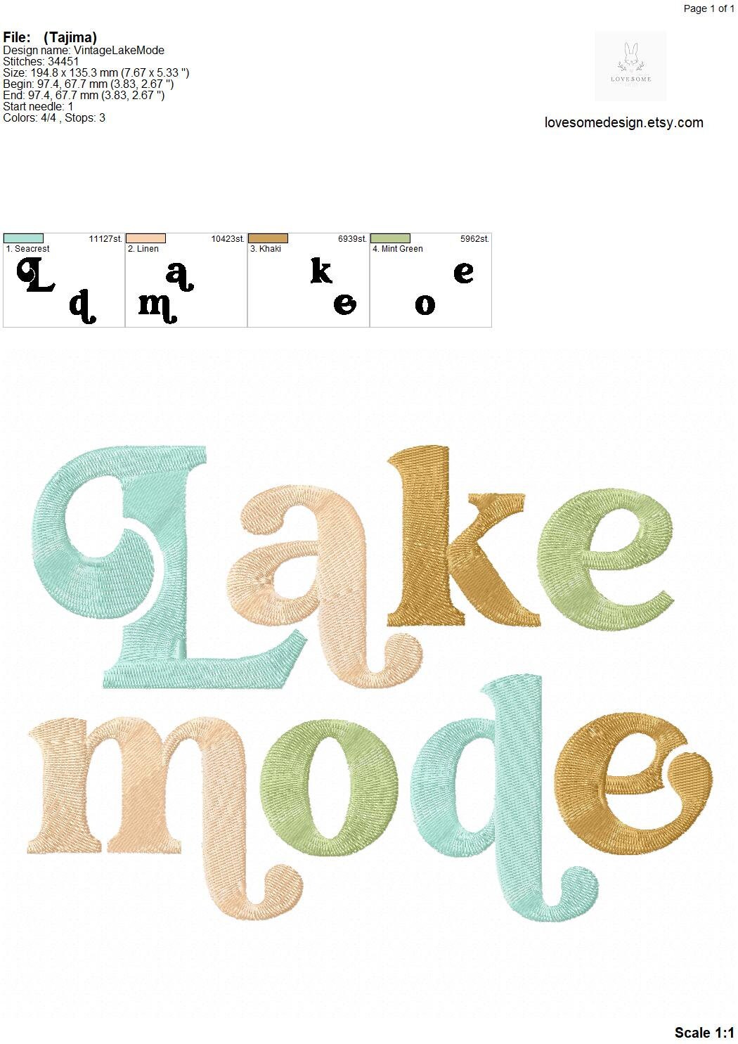 This listing features a machine embroidery design of lettering "Lake Mode" for retro style funky sweatshirt or groovy style tshirt embroidery in 8inch size.