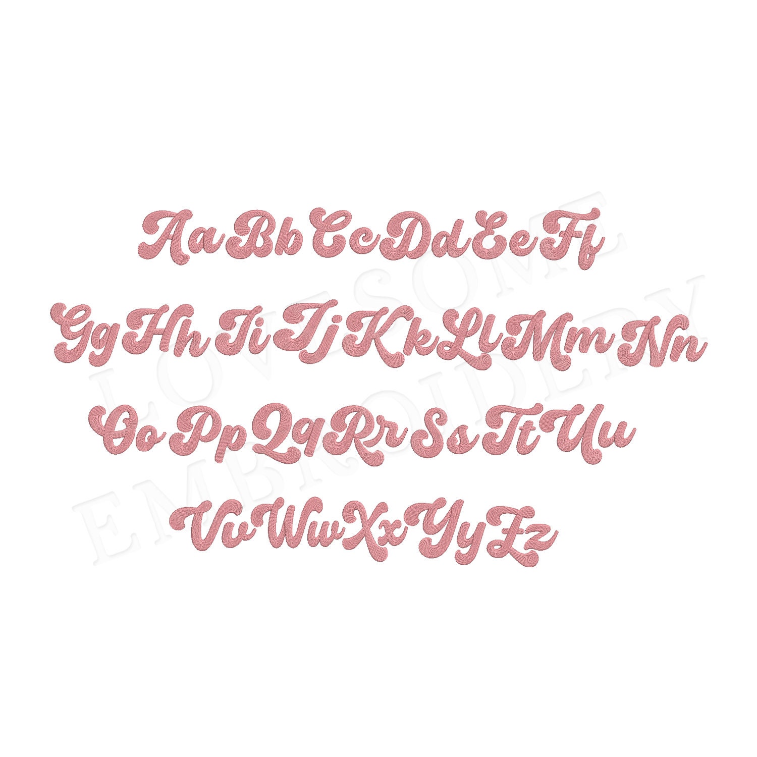 This listing features a machine embroidery retro font set which includes fill stitch groovy embroidery files of 26 uppercase and 26 lowercase letters in 1inch size. (For the whole set, pls see the listing images.)