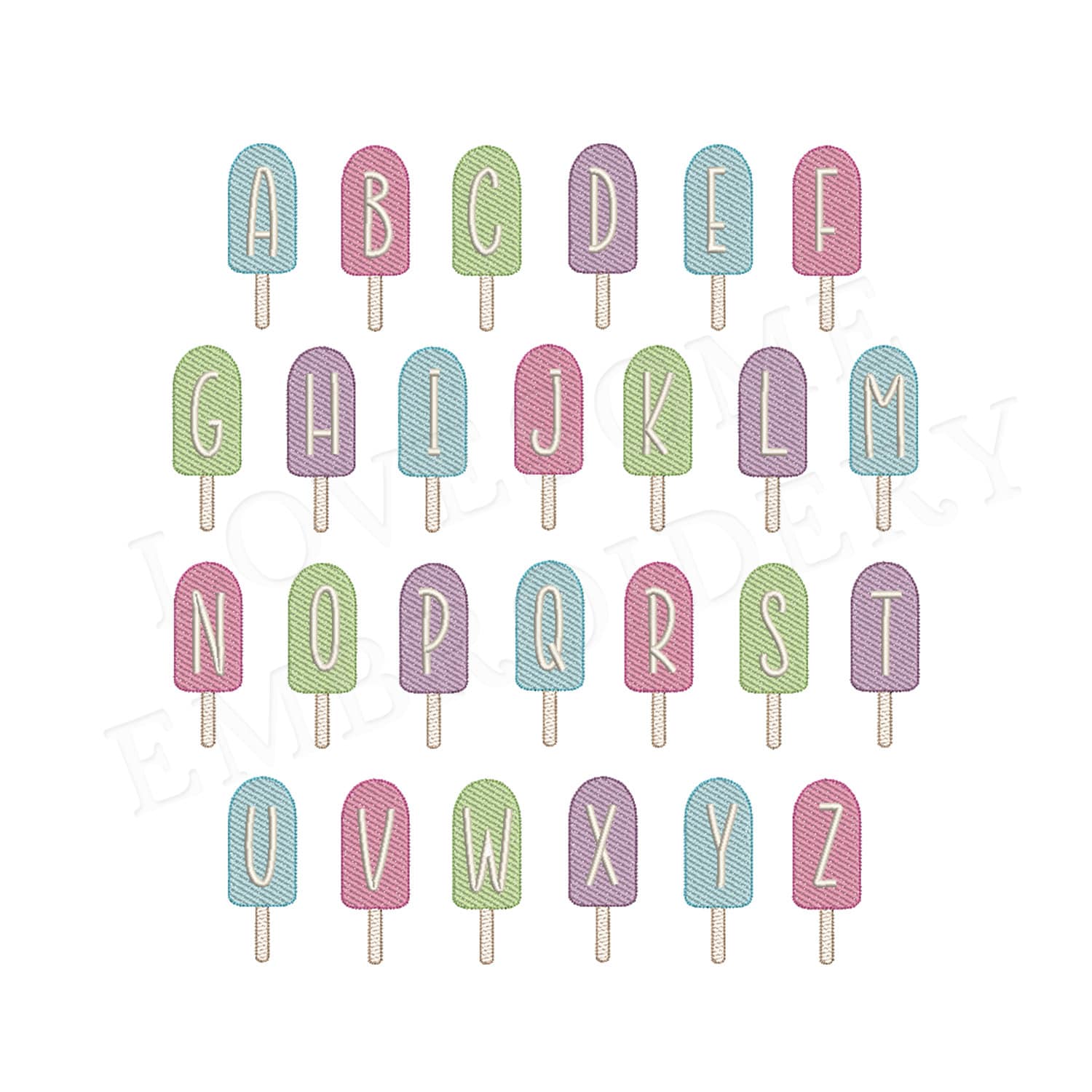 This listing features a machine embroidery font set which includes embroidery files of 26 uppercase quick stitch popsicle letters in 2inch size. (For the whole set, pls see the listing images.)