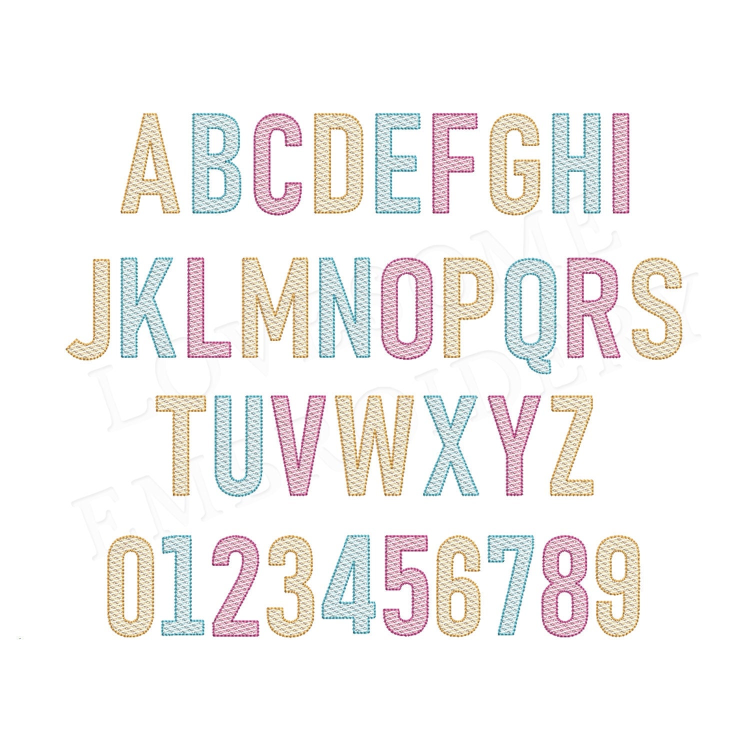 This listing features a machine embroidery font set which includes quick stitch (aka sketch fill) embroidery files of 26 uppercase letters A-Z and numbers 0-9 in 5inch size. (For the whole set, pls see the listing images.)