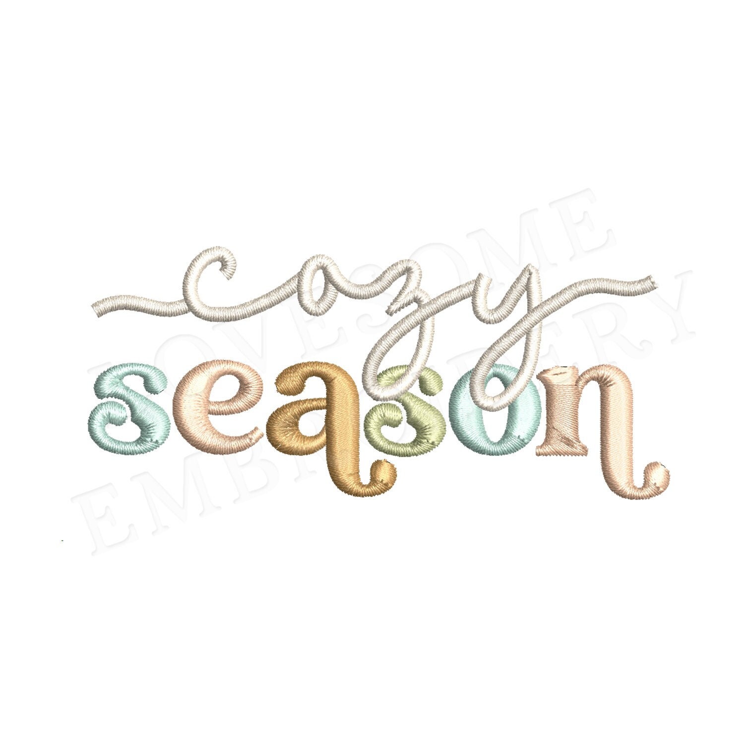 This listing features a machine embroidery design of lettering "Cozy Season" for retro style funky autumn sweatshirt or groovy style fall tshirt embroidery in 4inch size.