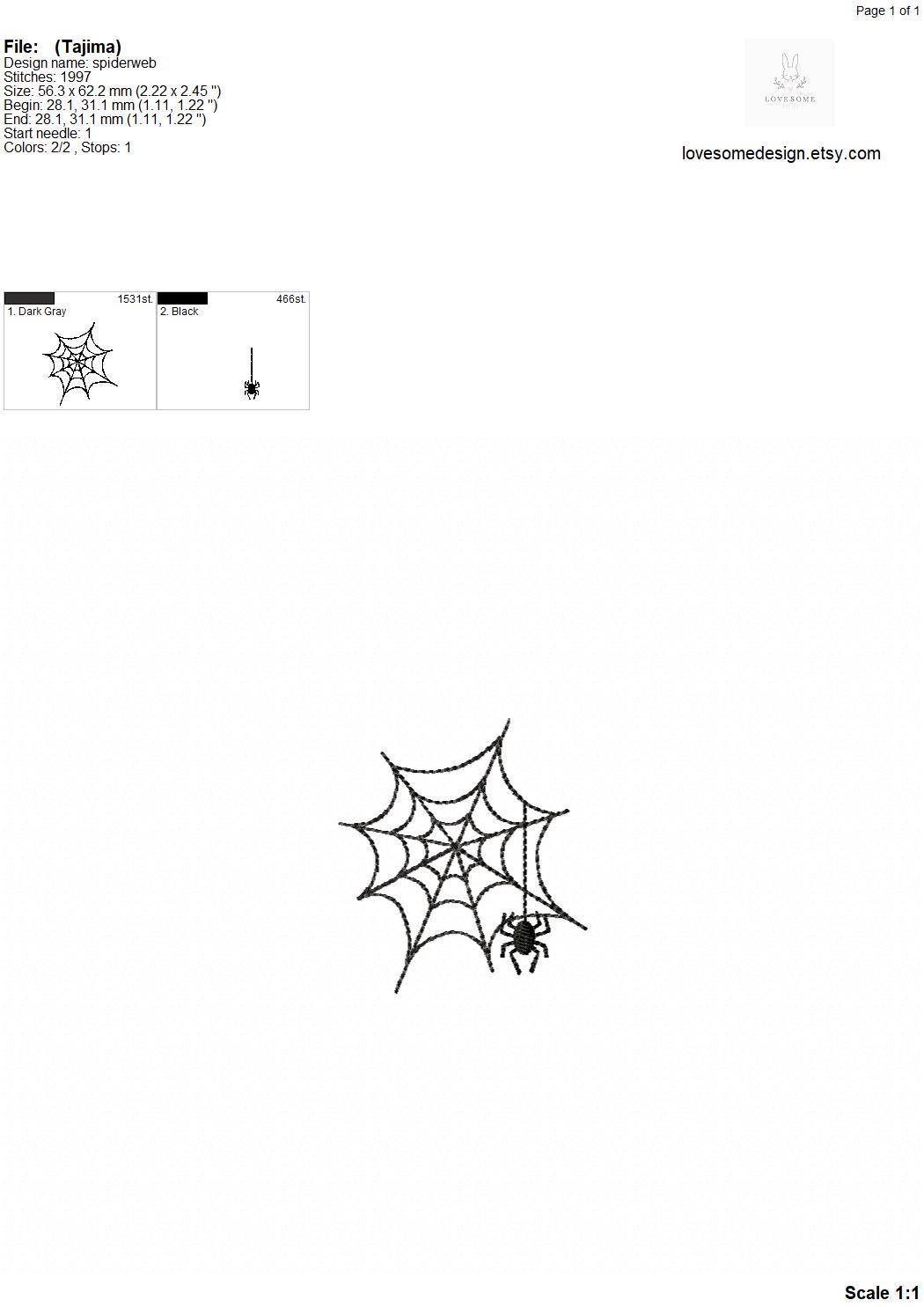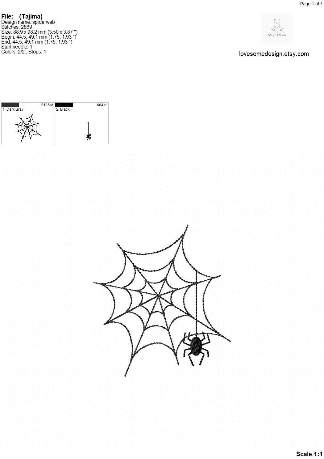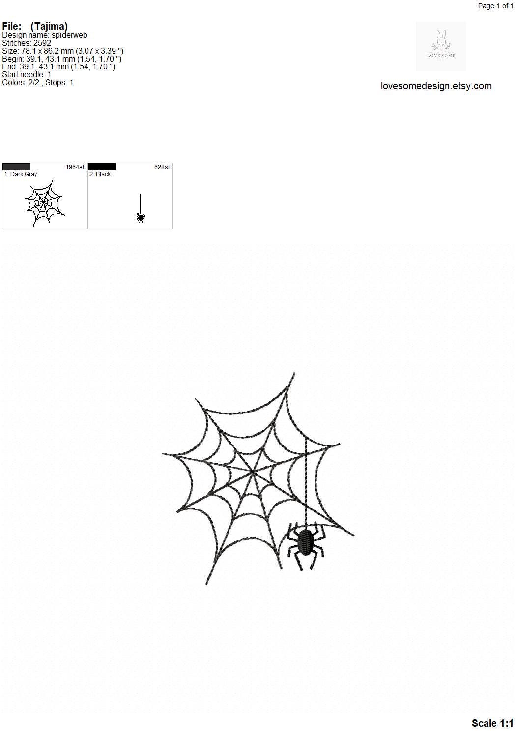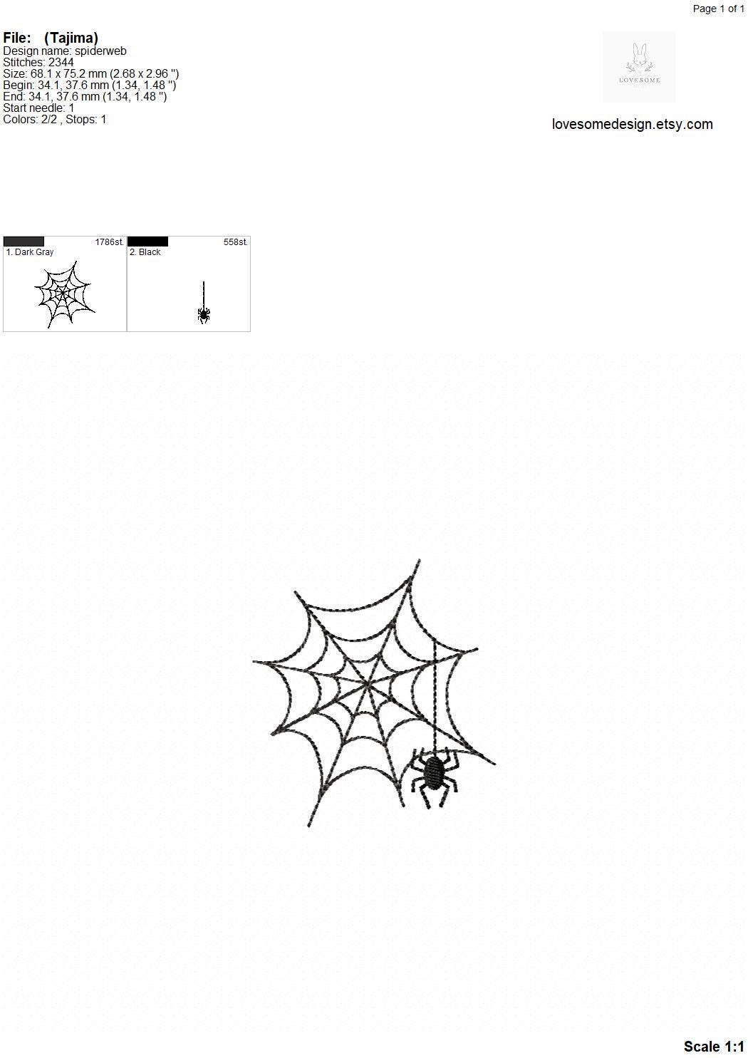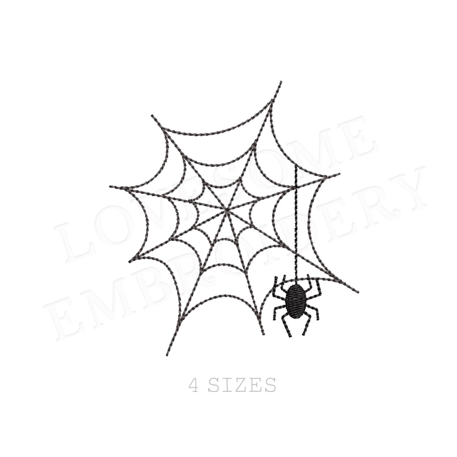 This listing includes a spider and web file for machine embroidery in four sizes, each appr. in 2.5inch, 3inch, 3.5inch and 4inch size.