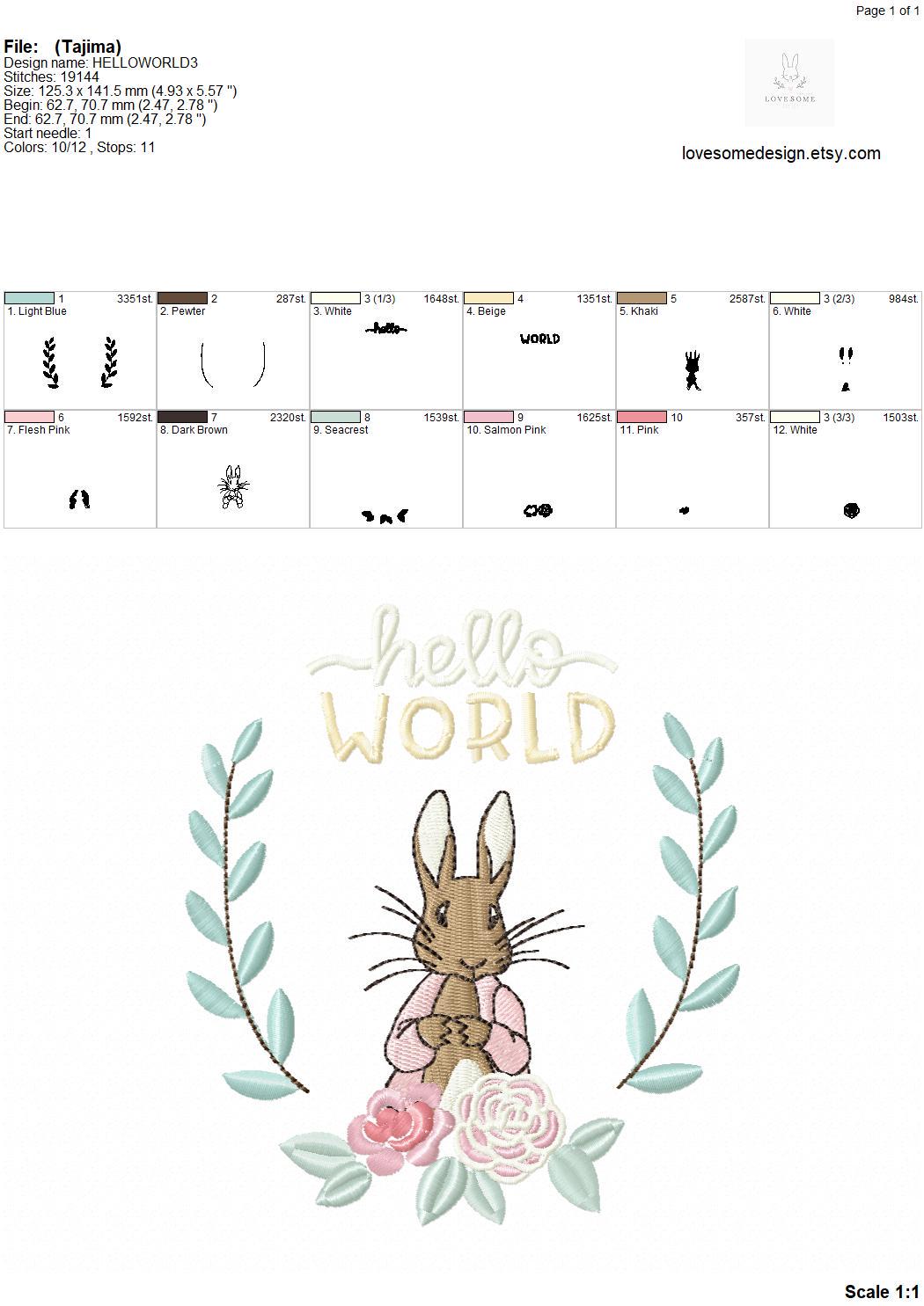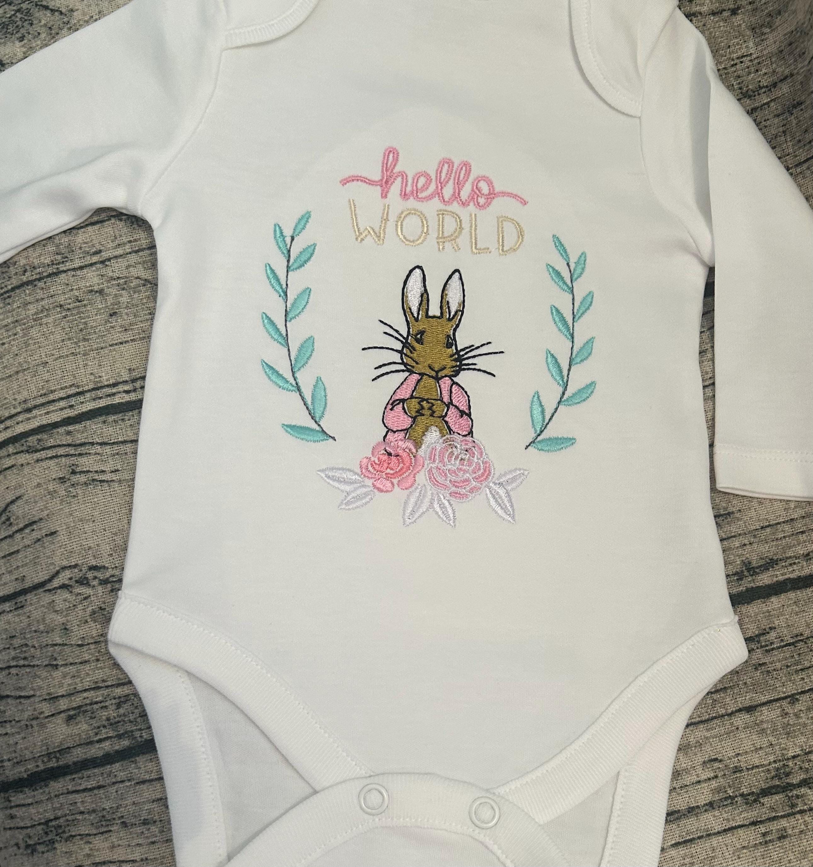 Hello World Floral 5x7 Flopsy Rabbit Machine Embroidery Design Digital Download | Lovesome Design