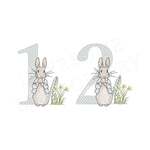 This listing features two machine embroidery files of floral Flopsy Rabbit with "Hello World" design in 5 inch size.