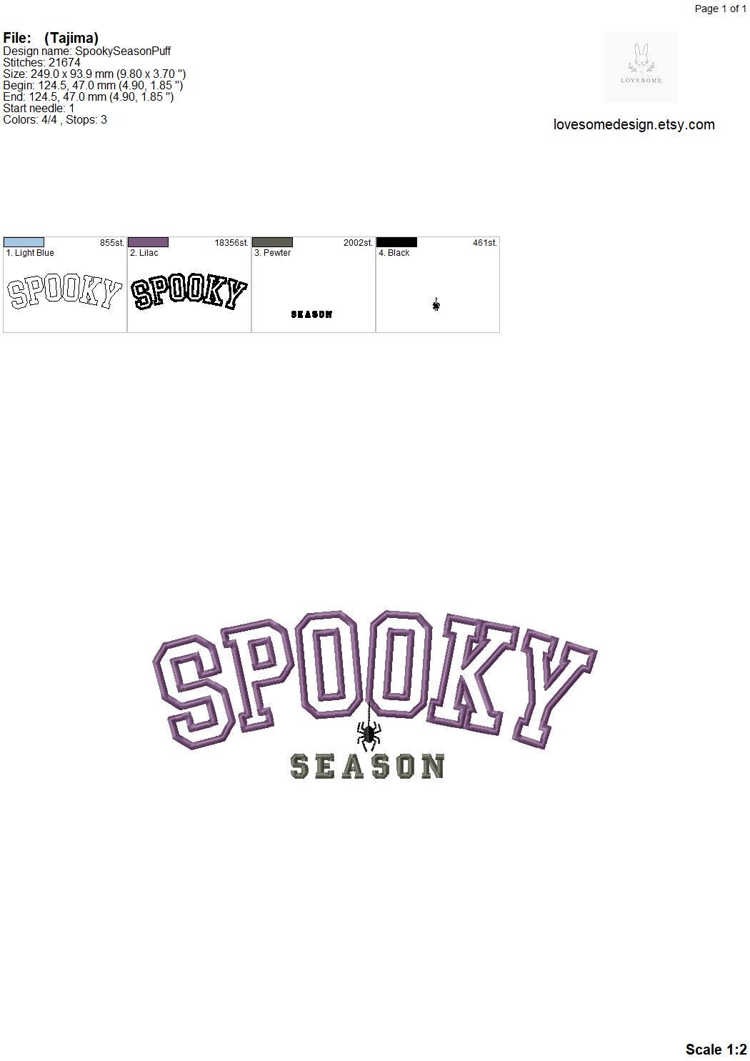 This listing features a machine embroidery design of puff 3D lettering "Spooky Season" with an optional spider (you may skip the step of the spider on your machine) for stylish halloween sweatshirt or sports tshirt embroidery in 10inch size.