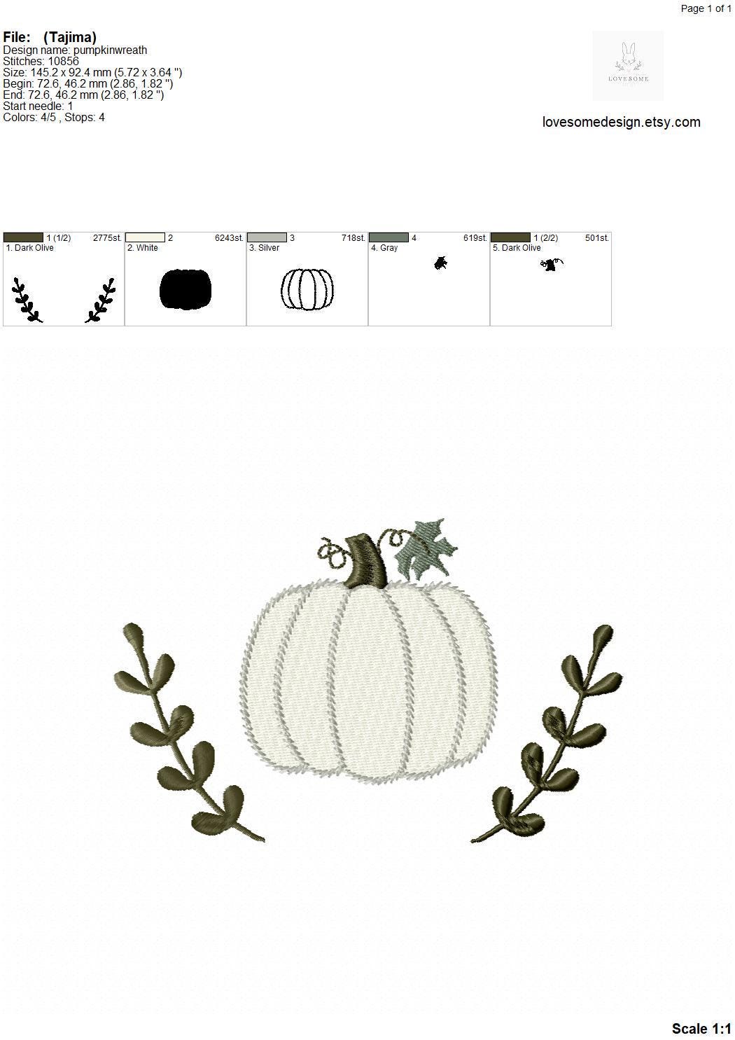 This listing features machine embroidery files of a stylish pumpkin wreath design in three sizes, including 4inch, 5inch and 6inch size.