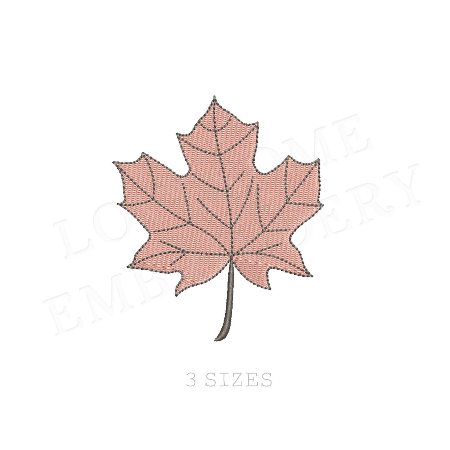 This listing features machine embroidery files of a stylish maple leaf design in three sizes, including 2inch, 3inch and 4inch size for embroidery hoop sizes 4x4 and bigger.