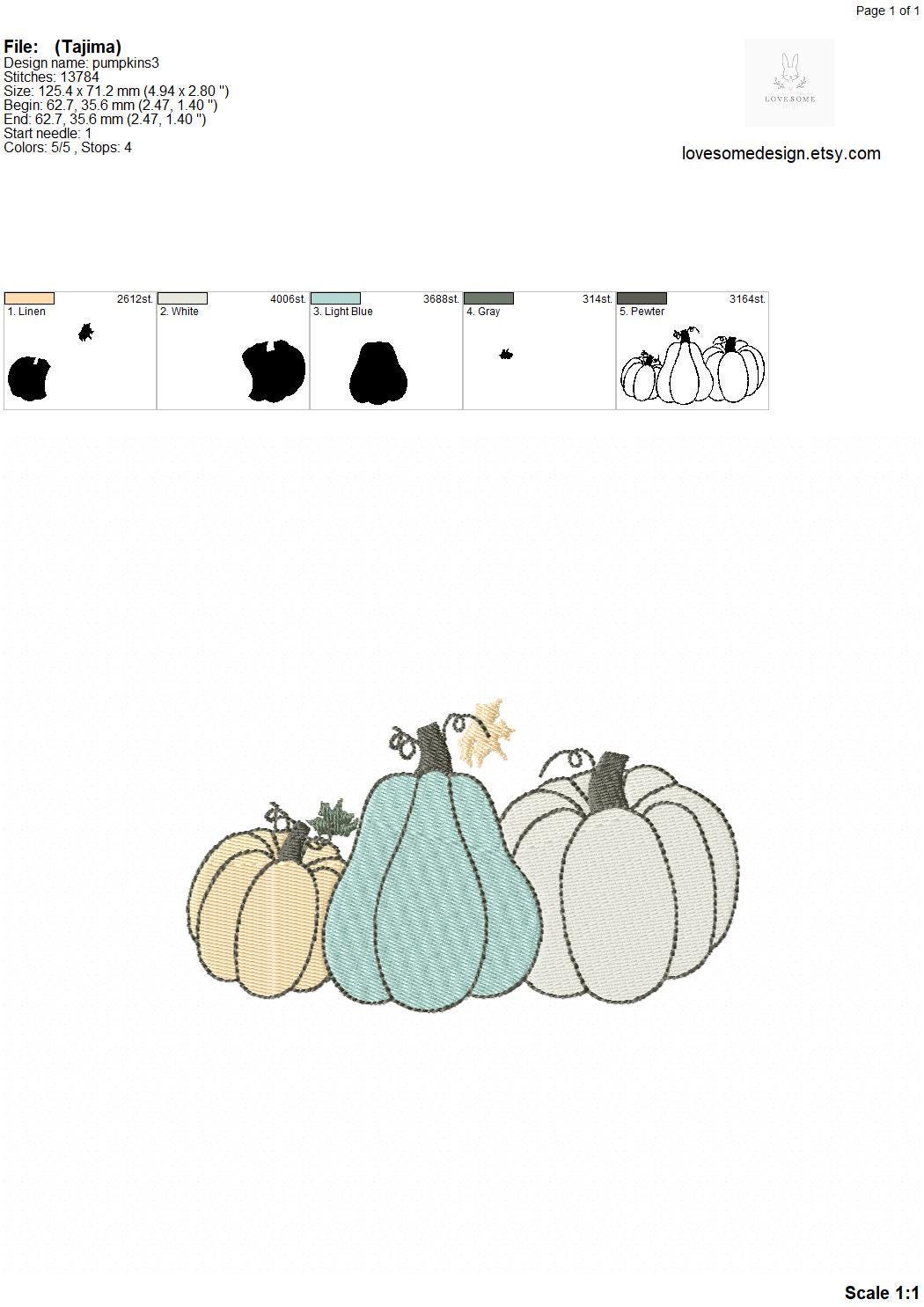 This listing features machine embroidery files of a stylish pumpkin patch design in 5inch size for embroidery hoop sizes 5x7 and bigger.