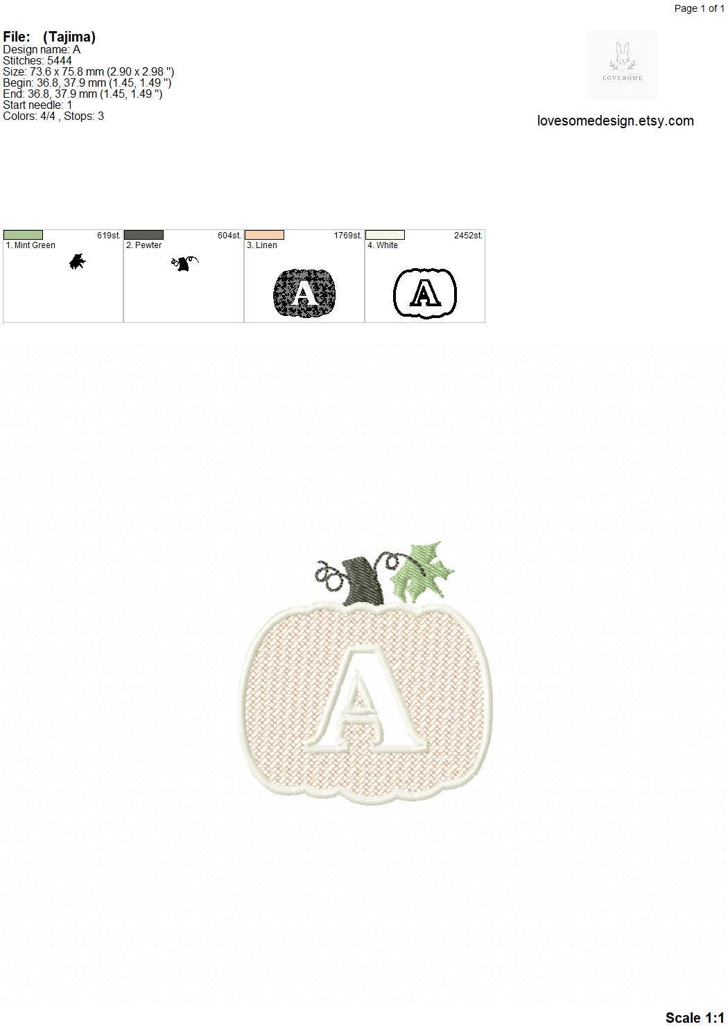 This listing features a machine embroidery font set which includes embroidery files of 26 uppercase letters stenciled in pumpkins in 3inch size. (For the whole set, pls see the listing images.)