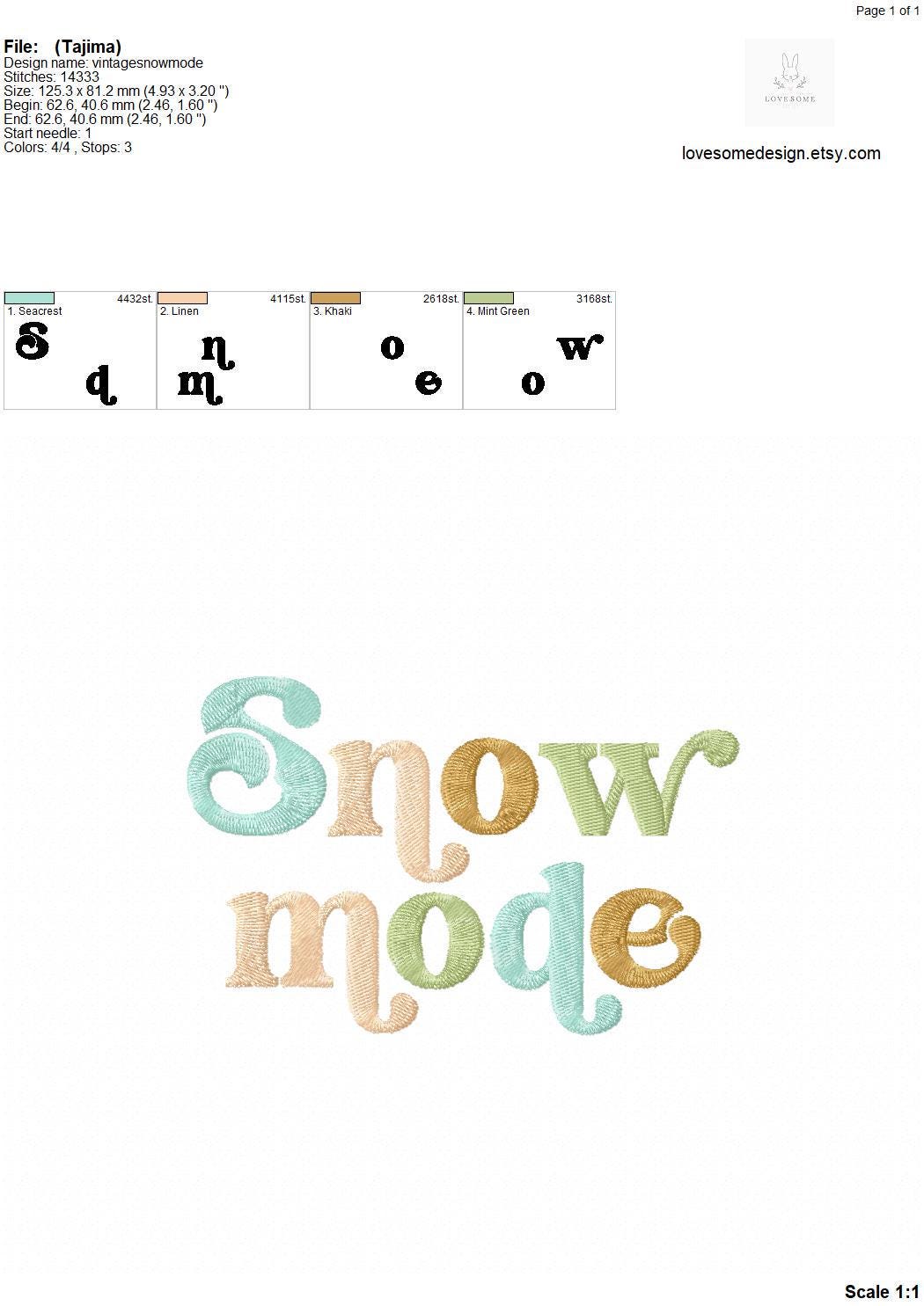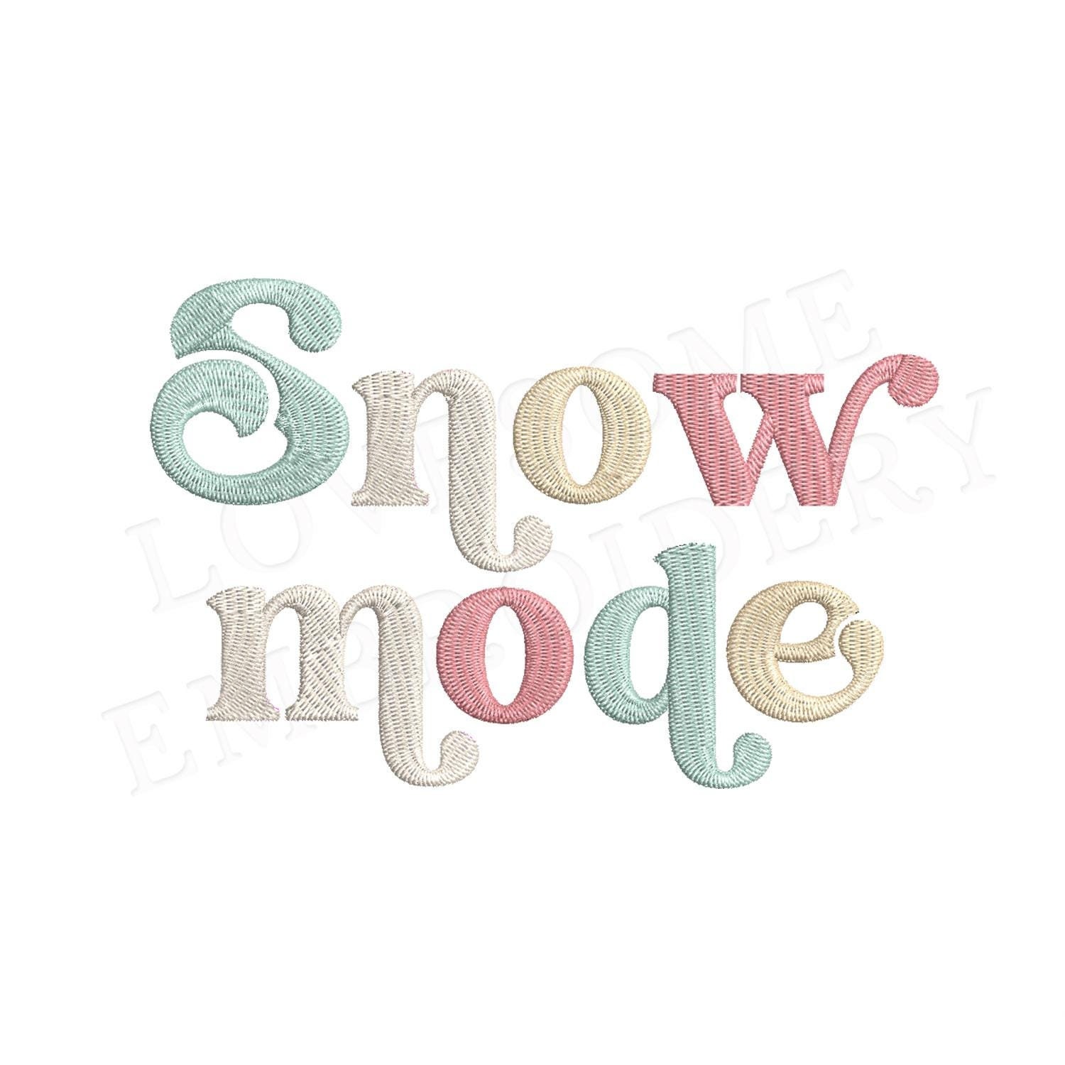 This listing features a machine embroidery design of lettering "Snow Mode" for retro style funky winter sweatshirt or groovy style winter tshirt embroidery in 5inch size.