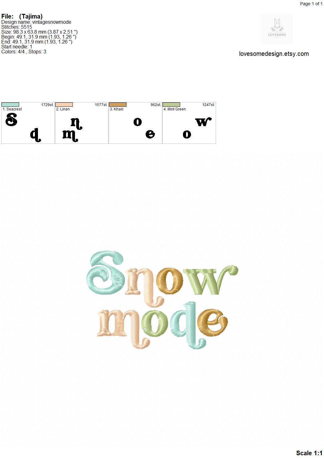 This listing features a machine embroidery design of lettering "Snow Mode" for retro style funky winter sweatshirt or groovy style winter tshirt embroidery in 4inch size.