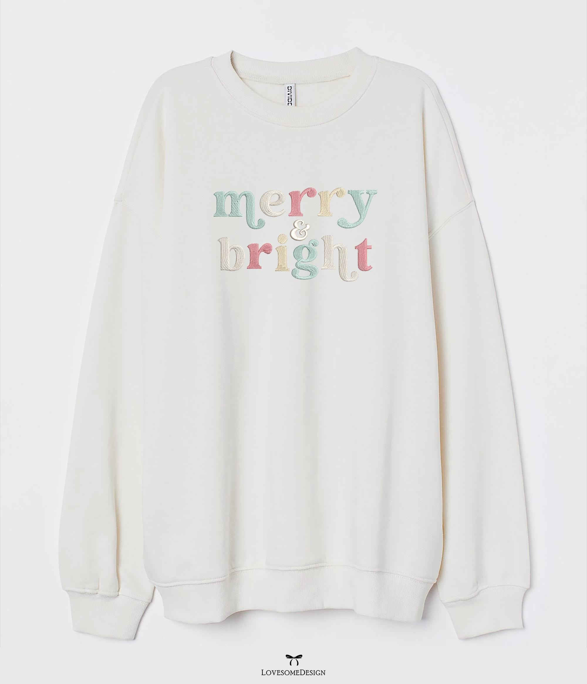 This listing features a machine embroidery design of lettering "merry & bright" for retro style funky winter sweatshirt or groovy style christmas sweatshirt embroidery in 7inch size.