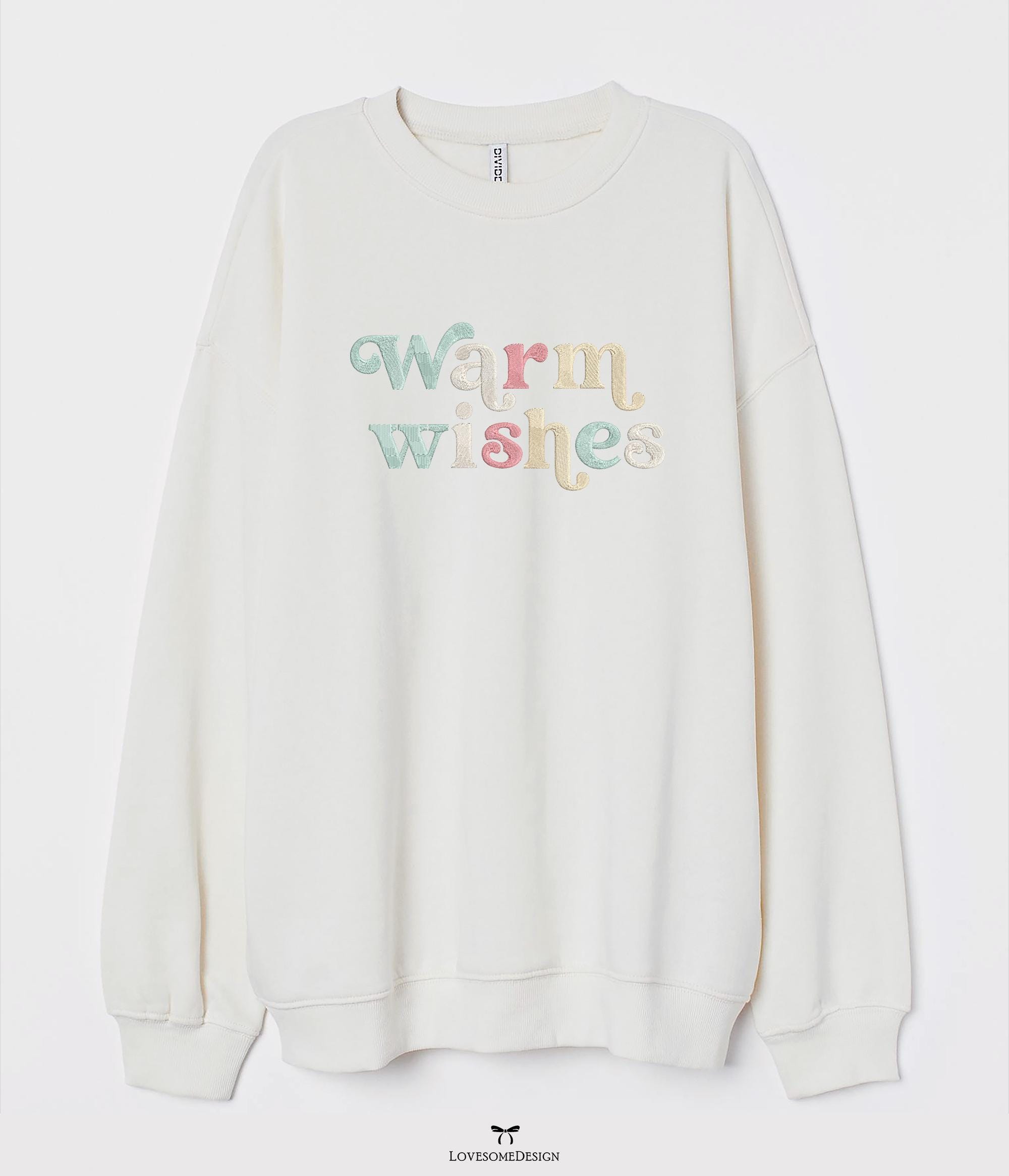 This listing features a machine embroidery design of lettering "'Warm wishes" for retro style funky winter sweatshirt or groovy style christmas sweatshirt embroidery in 5inch size.