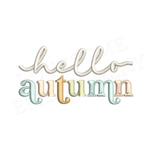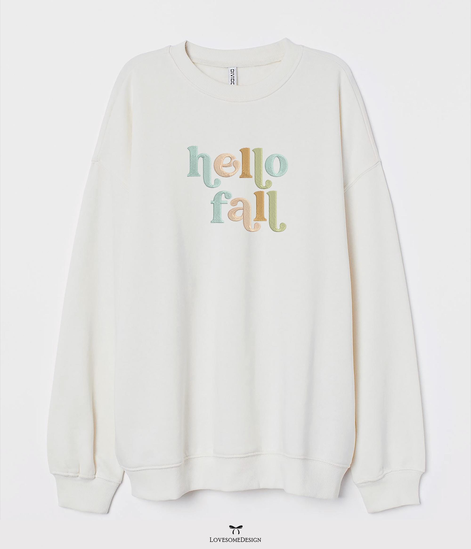 This listing features a machine embroidery design of lettering "Hello Fall" for retro style funky autumn sweatshirt or groovy style fall tshirt embroidery in 5inch size.