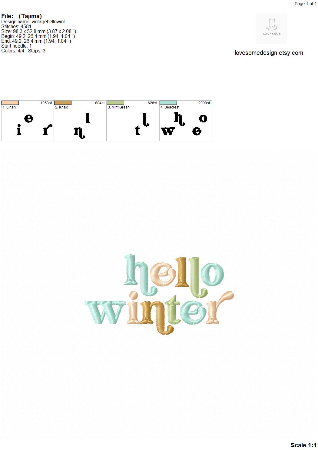 Hello Winter 4inch Machine Embroidery Design, Retro Style Funky Winter Colorful Tshirt Embroidery File | Lovesome Design