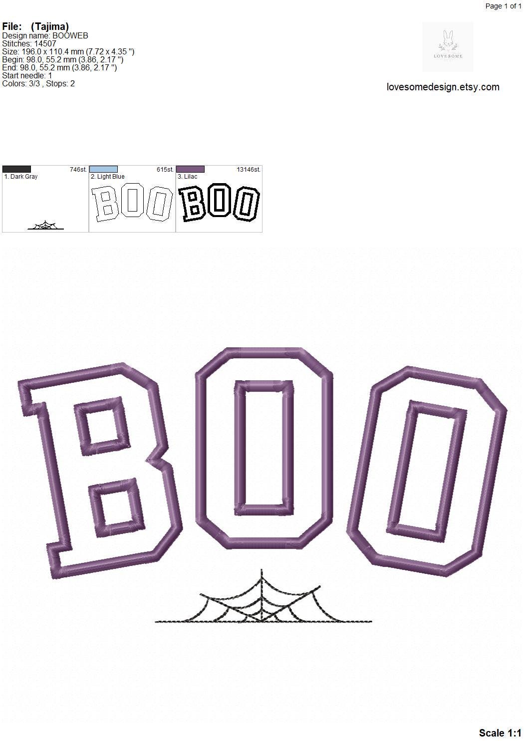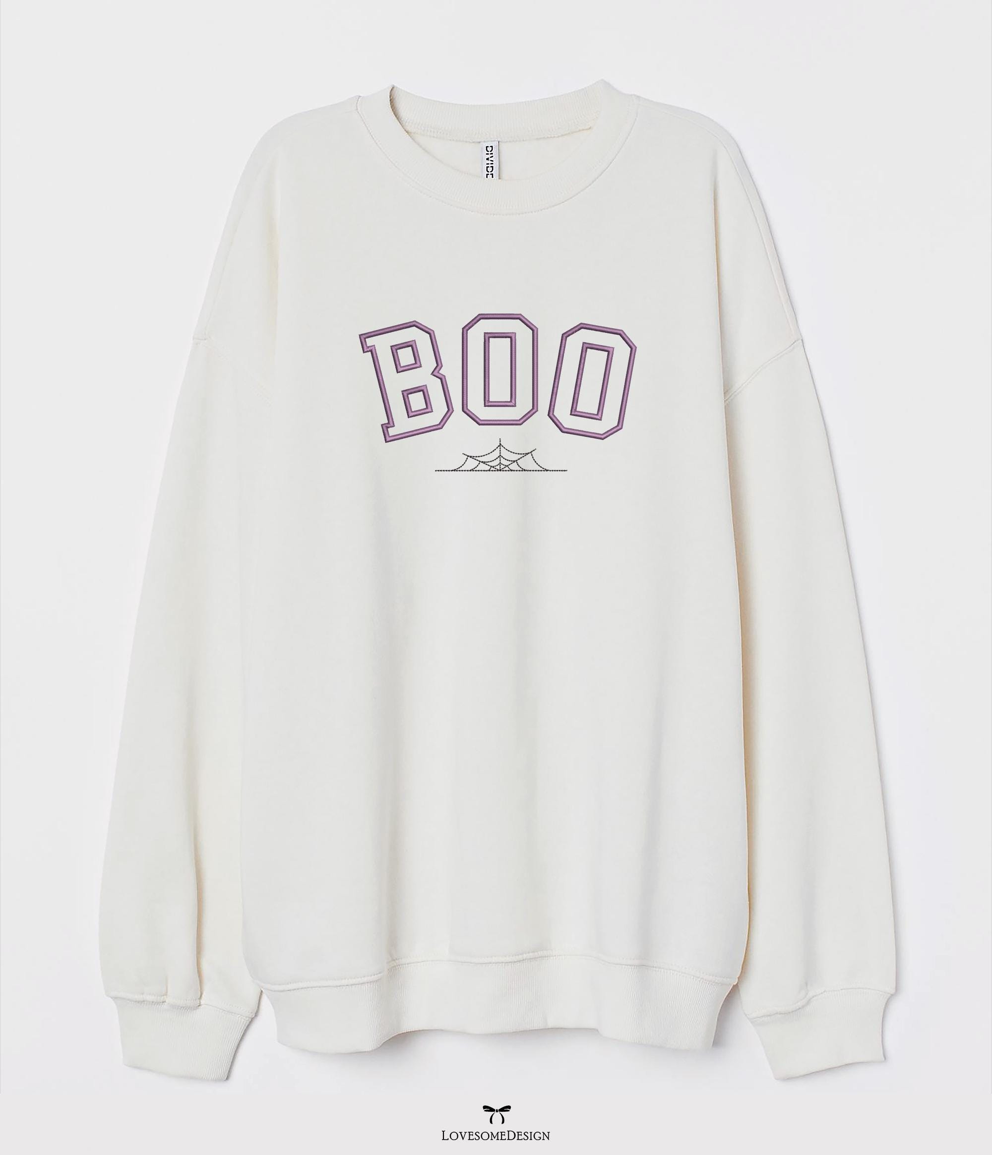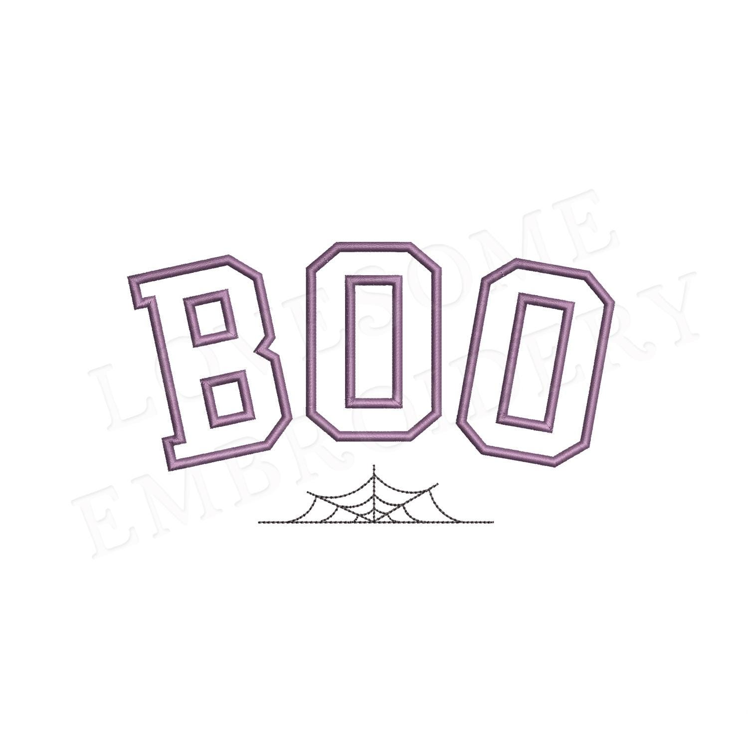 This listing features a machine embroidery design of puff 3D lettering "Boo" with a spider web for stylish halloween sweatshirt or sports tshirt embroidery in 8inch size.
