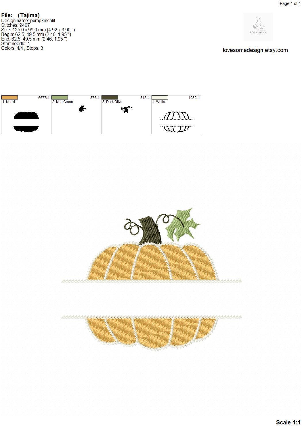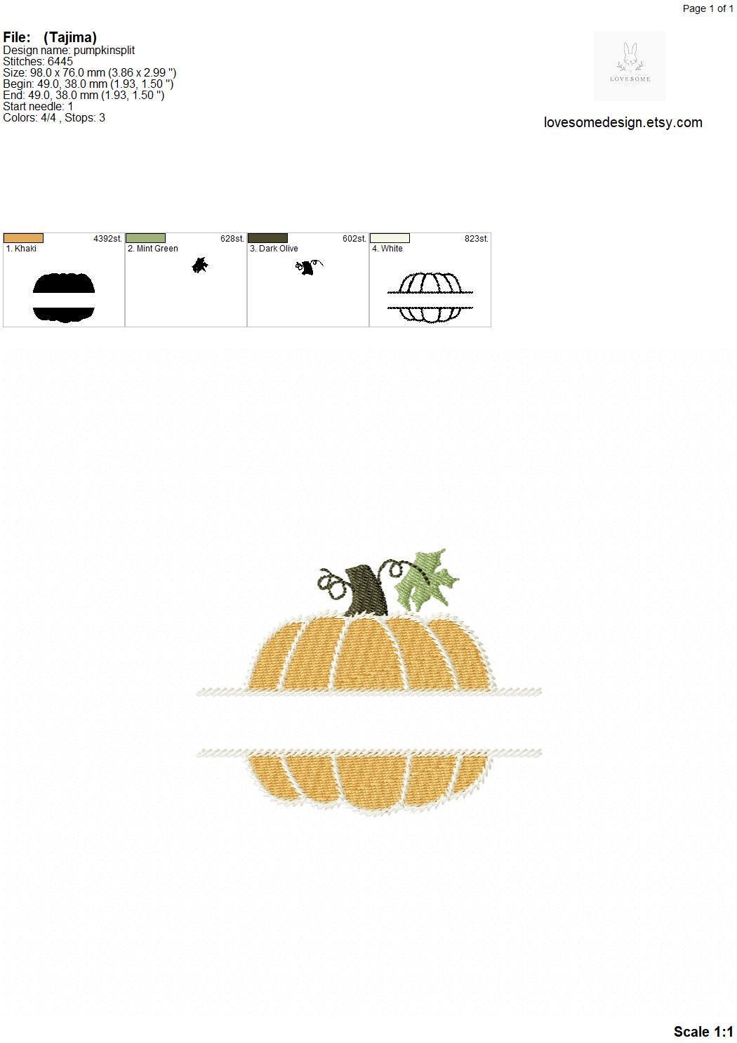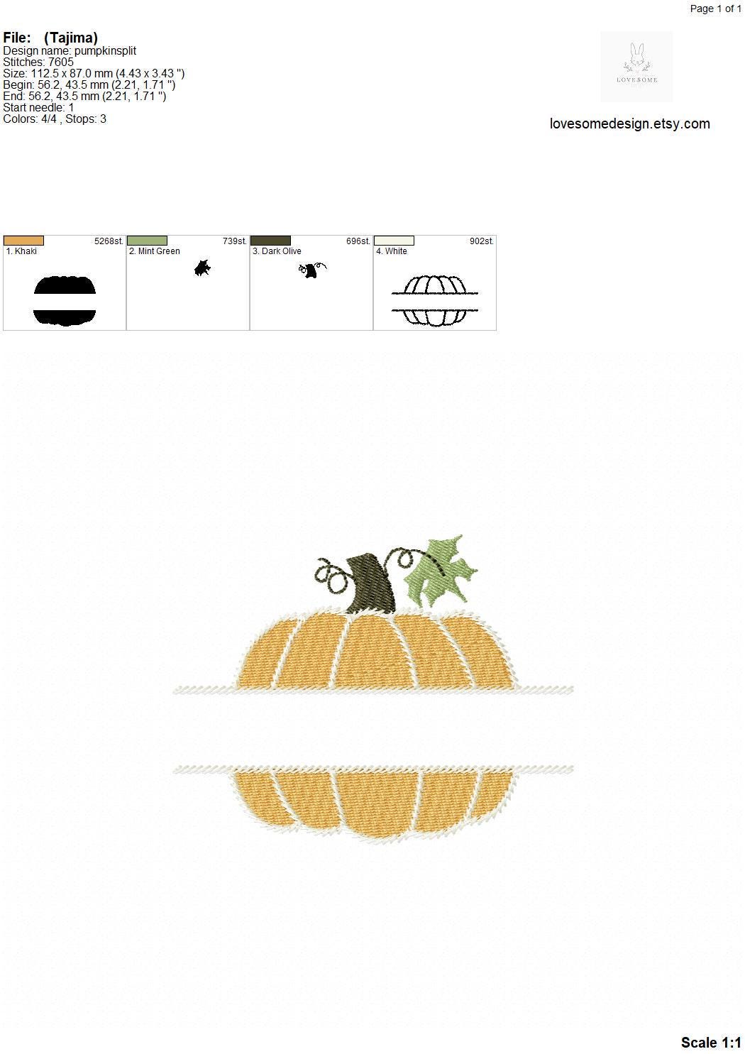 This listing features machine embroidery files of a stylish split pumpkin design in three sizes, including 4inch, 4.5inch and 5inch size for embroidery hoop sizes 4x4 and bigger.