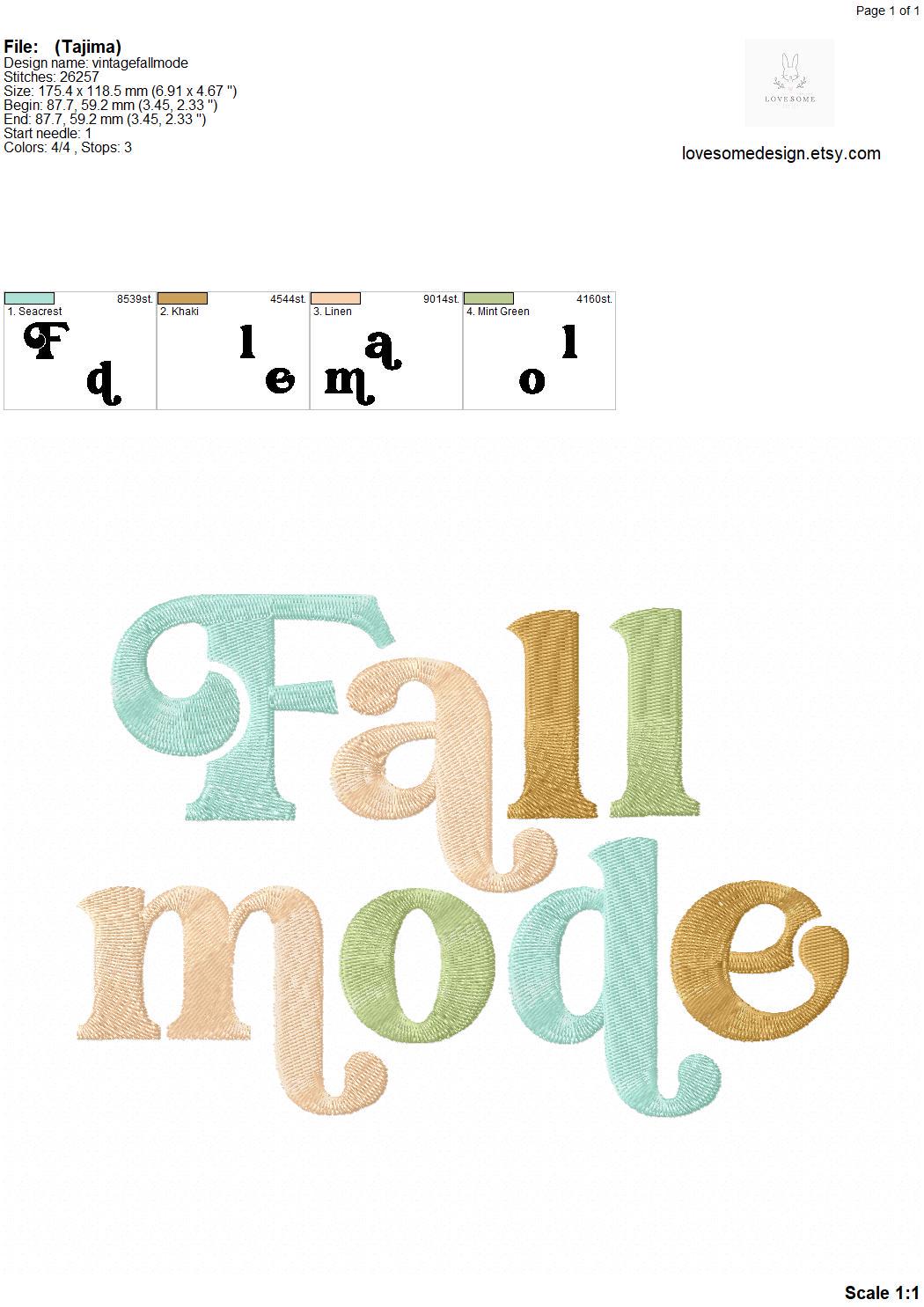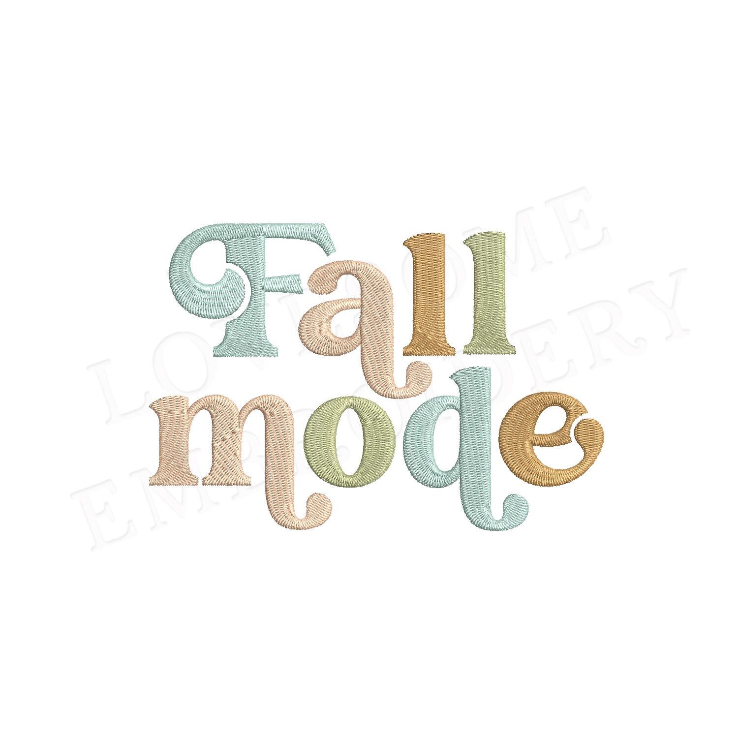 This listing features a machine embroidery design of lettering "Fall Mode" for retro style funky autumn sweatshirt or groovy style fall tshirt embroidery in 7inch size.