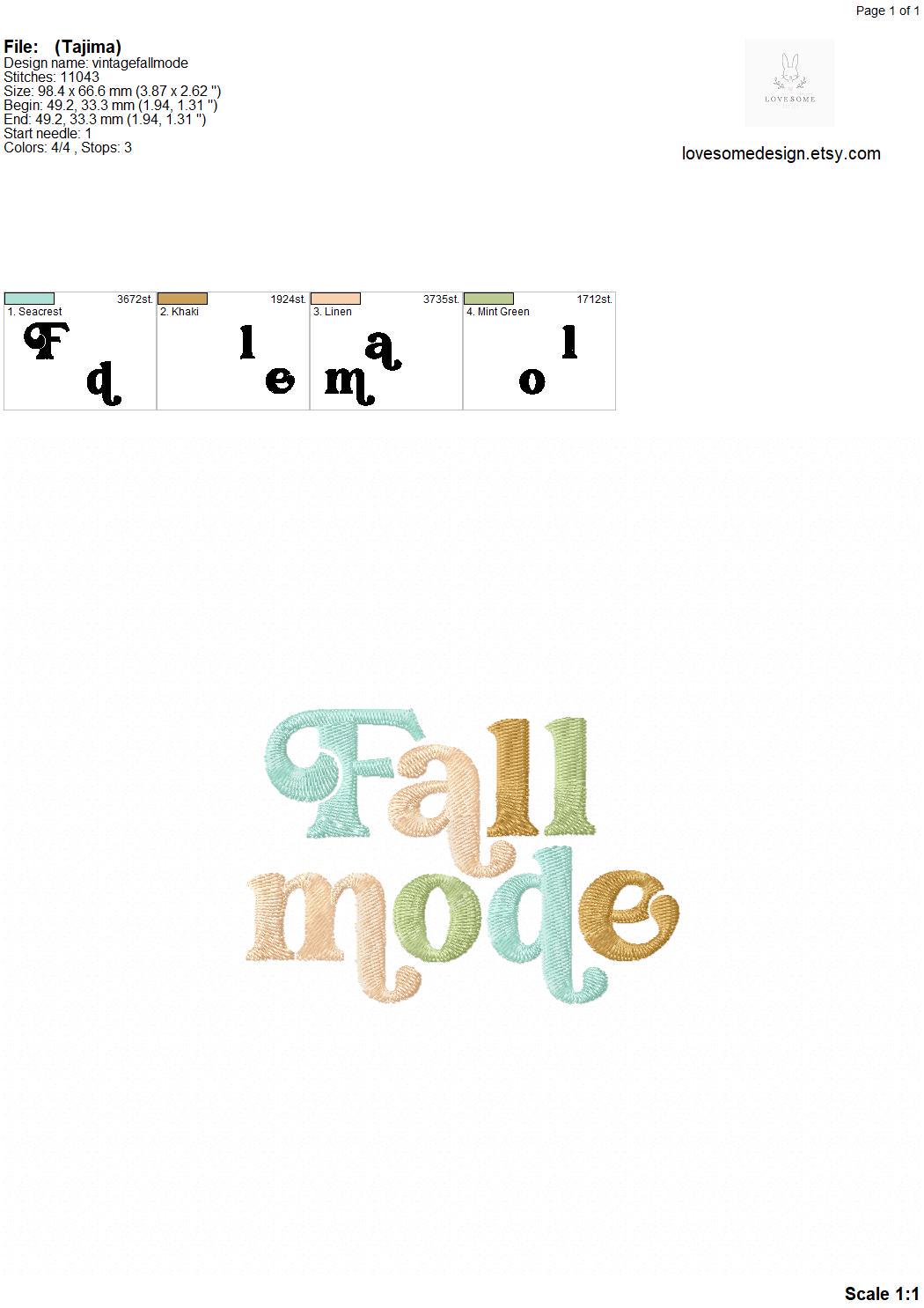 This listing features a machine embroidery design of lettering "Fall Mode" for retro style funky autumn sweatshirt or groovy style fall tshirt embroidery in 4inch size.