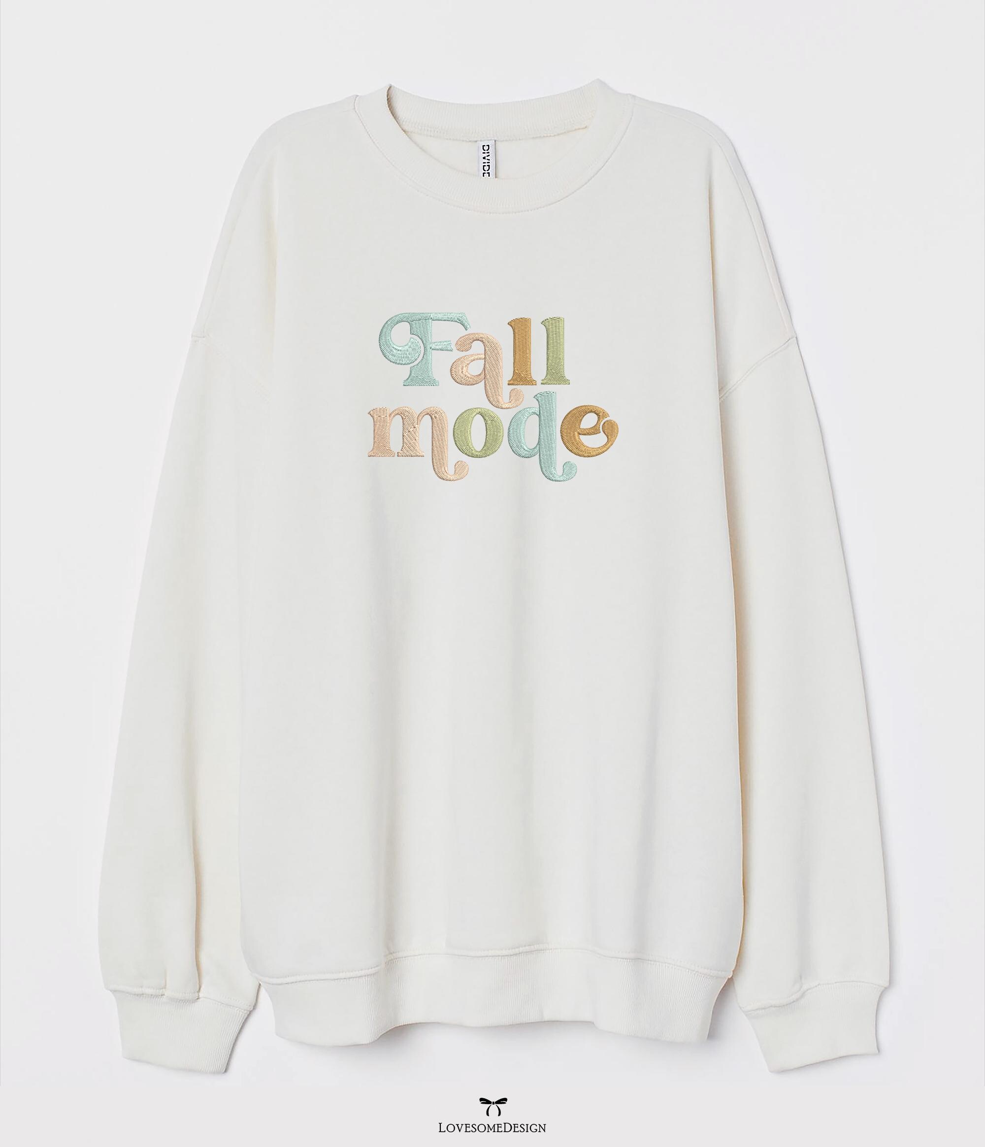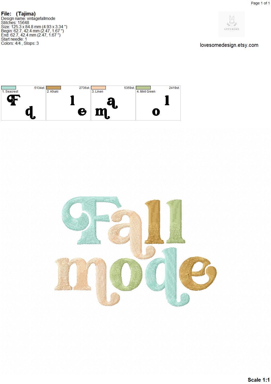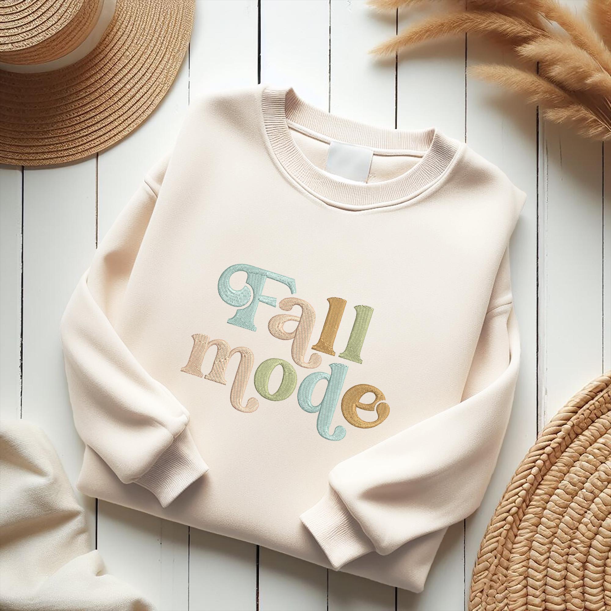 This listing features a machine embroidery design of lettering "Fall Mode" for retro style funky autumn sweatshirt or groovy style fall tshirt embroidery in 5inch size.