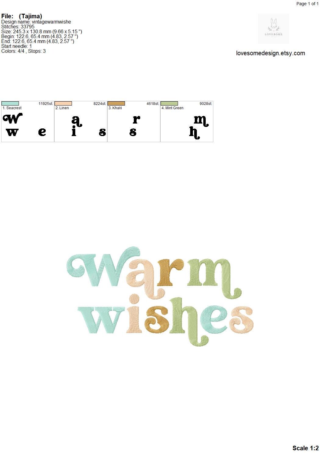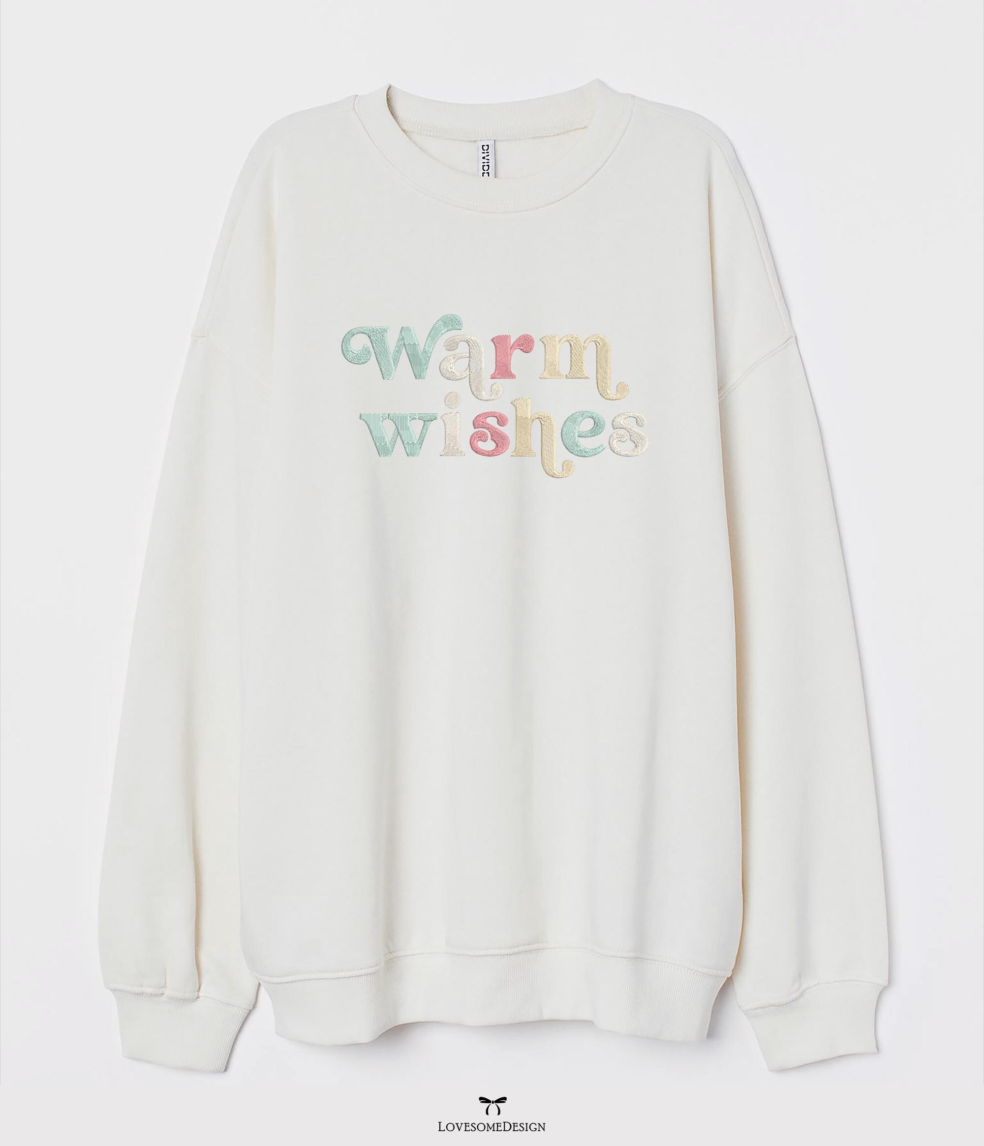This listing features a machine embroidery design of lettering "'Warm wishes" for retro style funky winter sweatshirt or groovy style christmas sweatshirt embroidery in 10inch size.