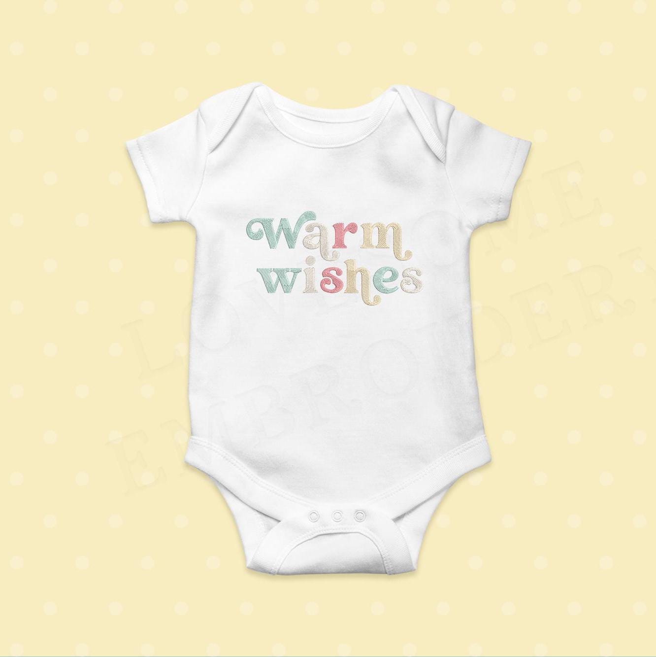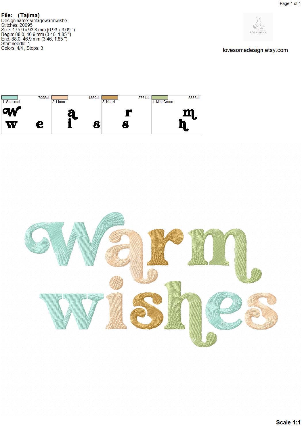 This listing features a machine embroidery design of lettering "'Warm wishes" for retro style funky winter sweatshirt or groovy style christmas sweatshirt embroidery in 7inch size.