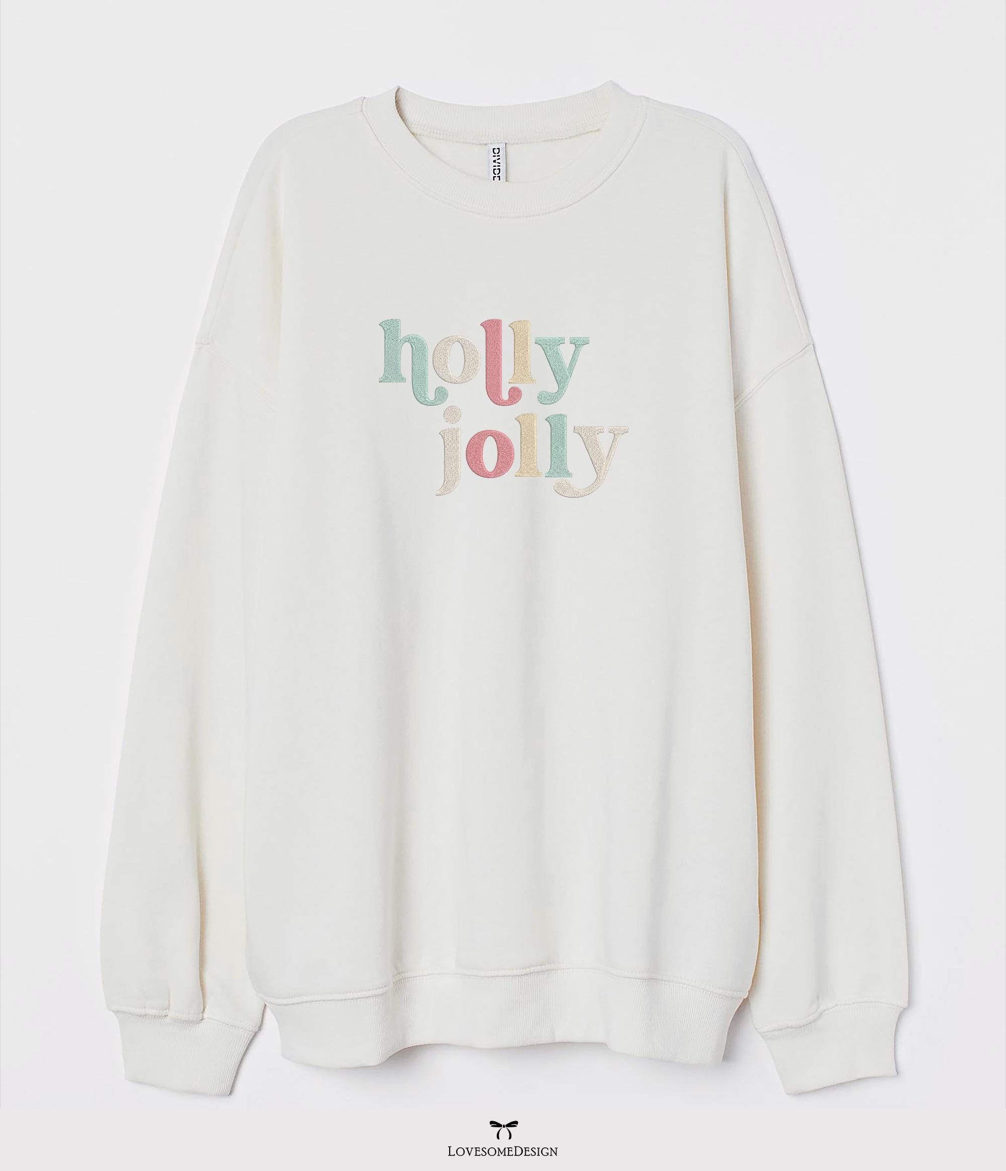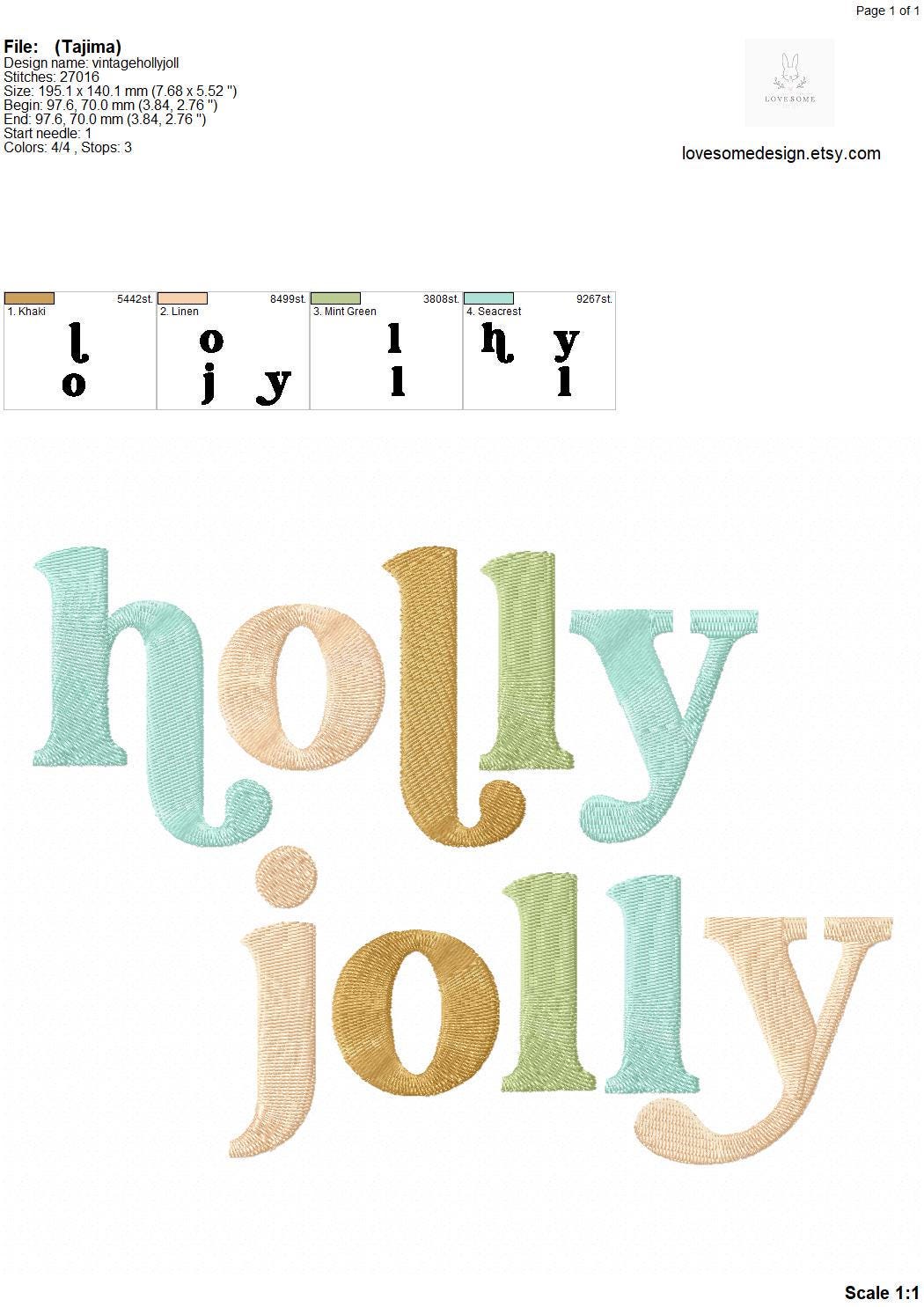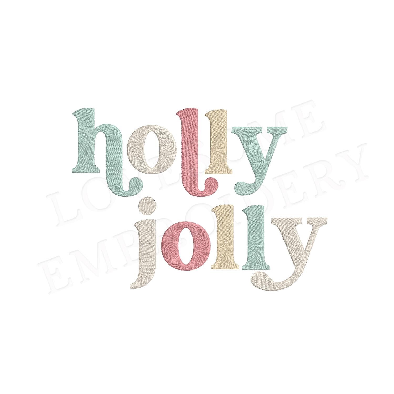 This listing features a machine embroidery design of lettering "'holly jolly" for retro style funky winter sweatshirt or groovy style christmas sweatshirt embroidery in 8inch size.