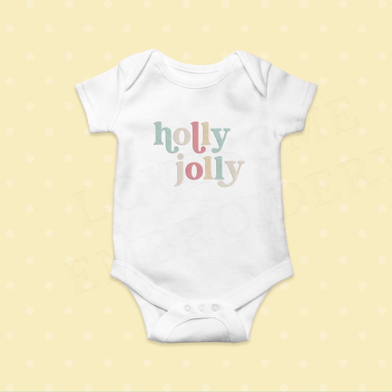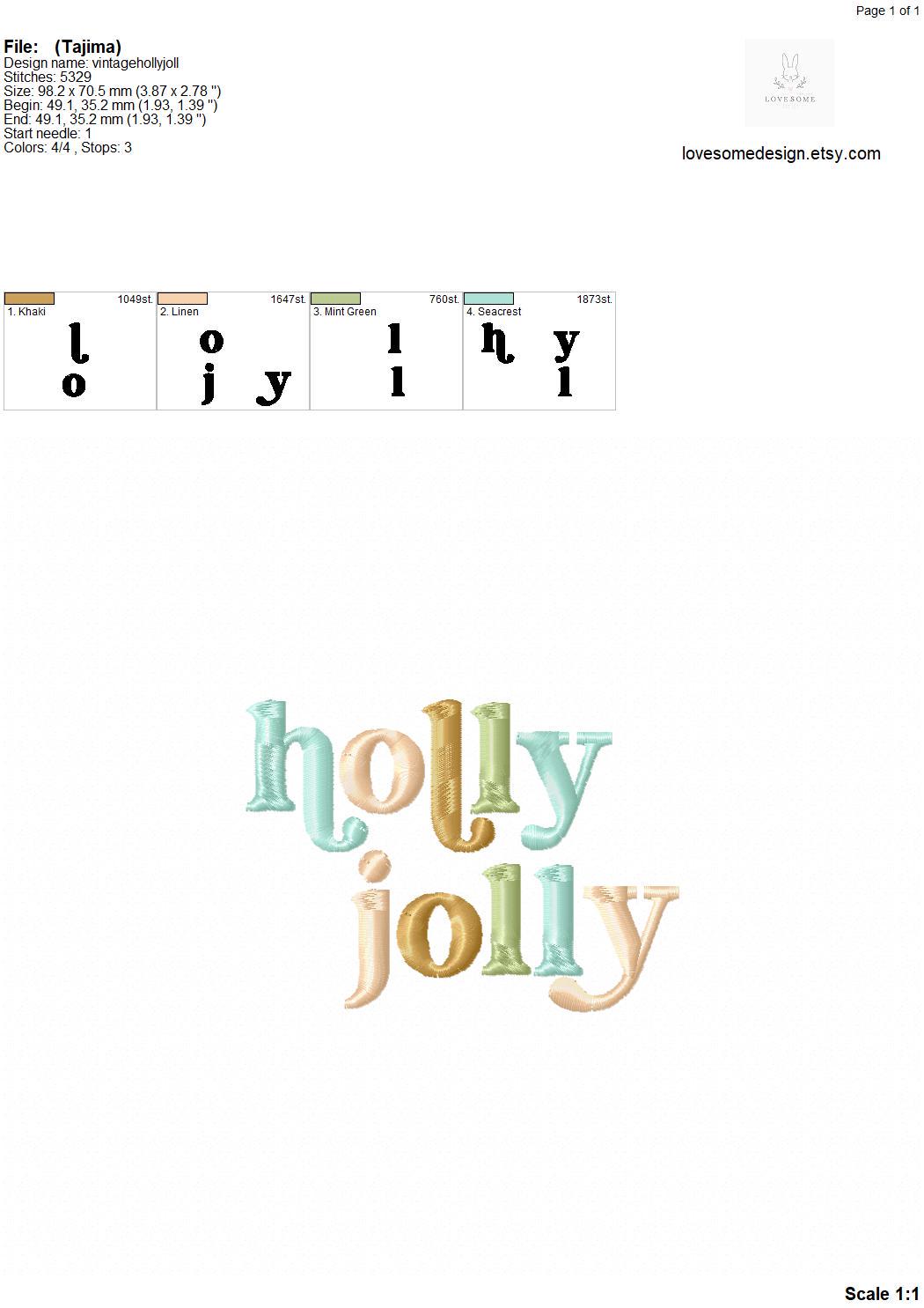 This listing features a machine embroidery design of lettering "'holly jolly" for retro style funky winter sweatshirt or groovy style christmas sweatshirt embroidery in 4inch size.
